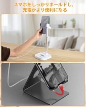 【スマホスタンド 卓上 高さ調整30cm-45cm】一般的な携帯電話ホルダーとは異なり、高さの調節に改良・加工を施しています。卓上スマホスタンドは30cm-45cmに調節可能、携帯電話が回転することで幅広い角度に対応し、デッドスペースがなく、安定性が大幅に向上しました。さらに調節可能な傾きは最も快適な視野角と人間工学に基づいた高さを与え、手を解放しながら最高の視覚体験を提供します。また、充電ケーブルに十分なスペースを提供できし、低いタイプと比べて断線の心配がありません。