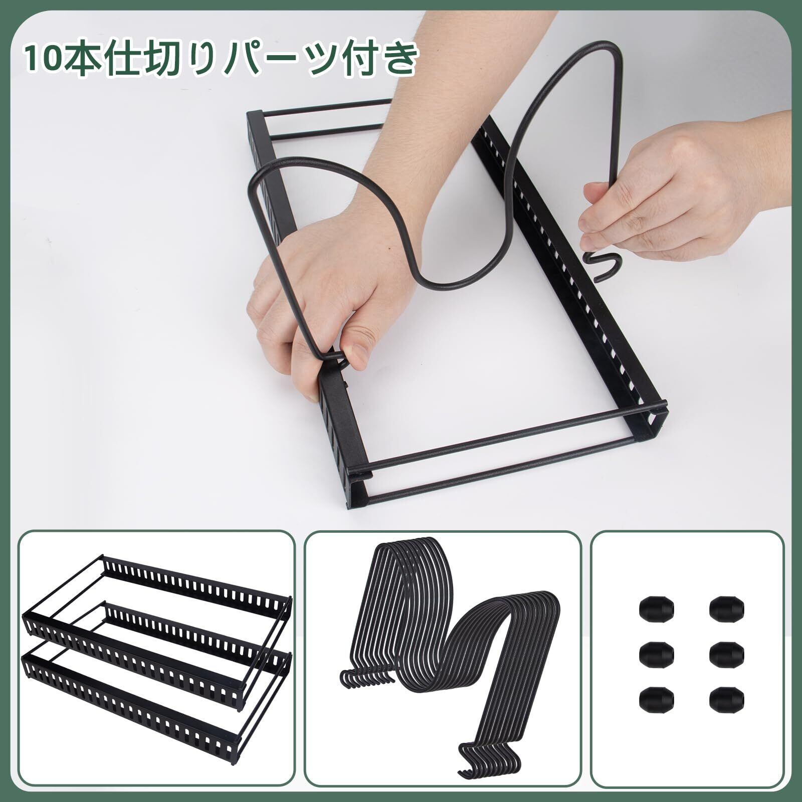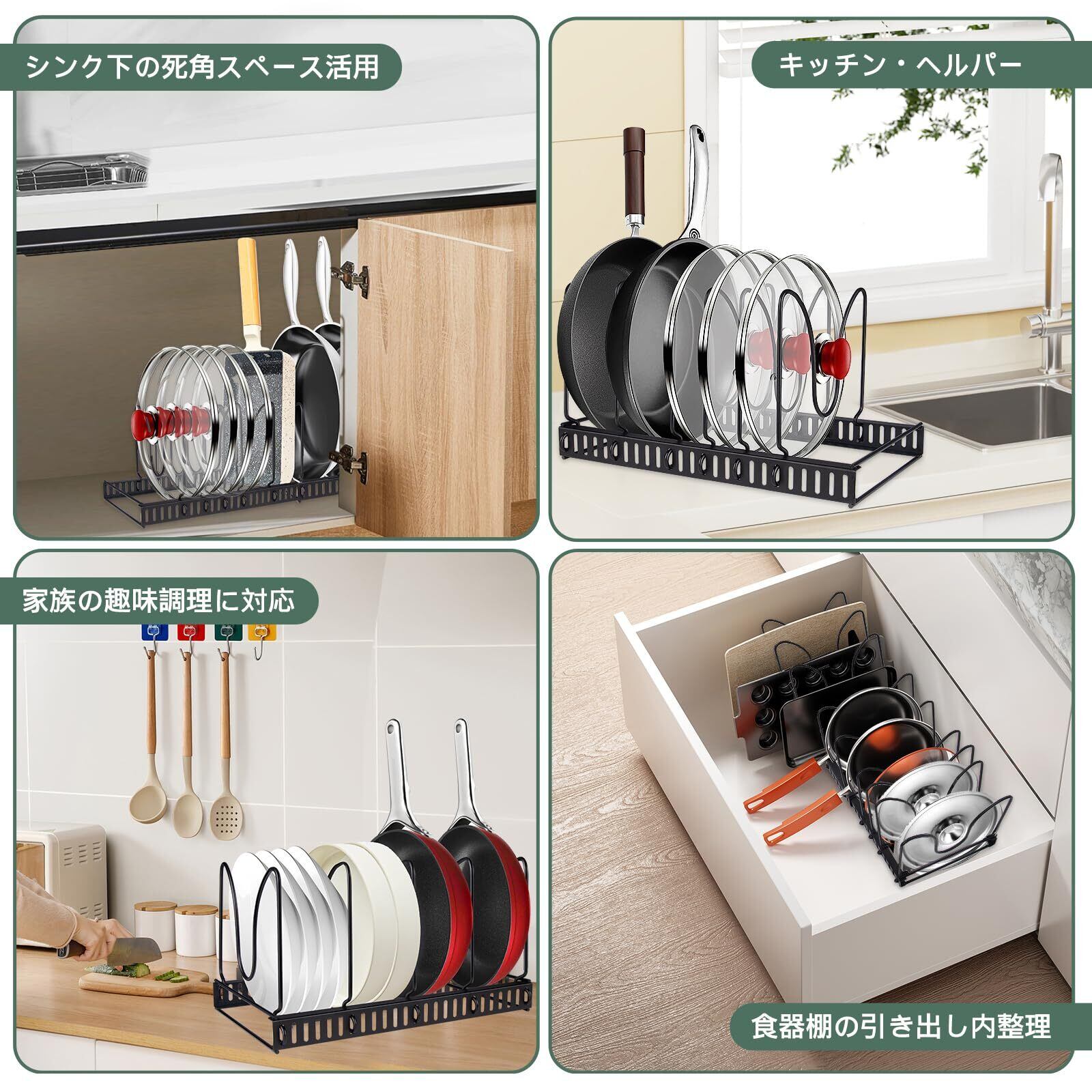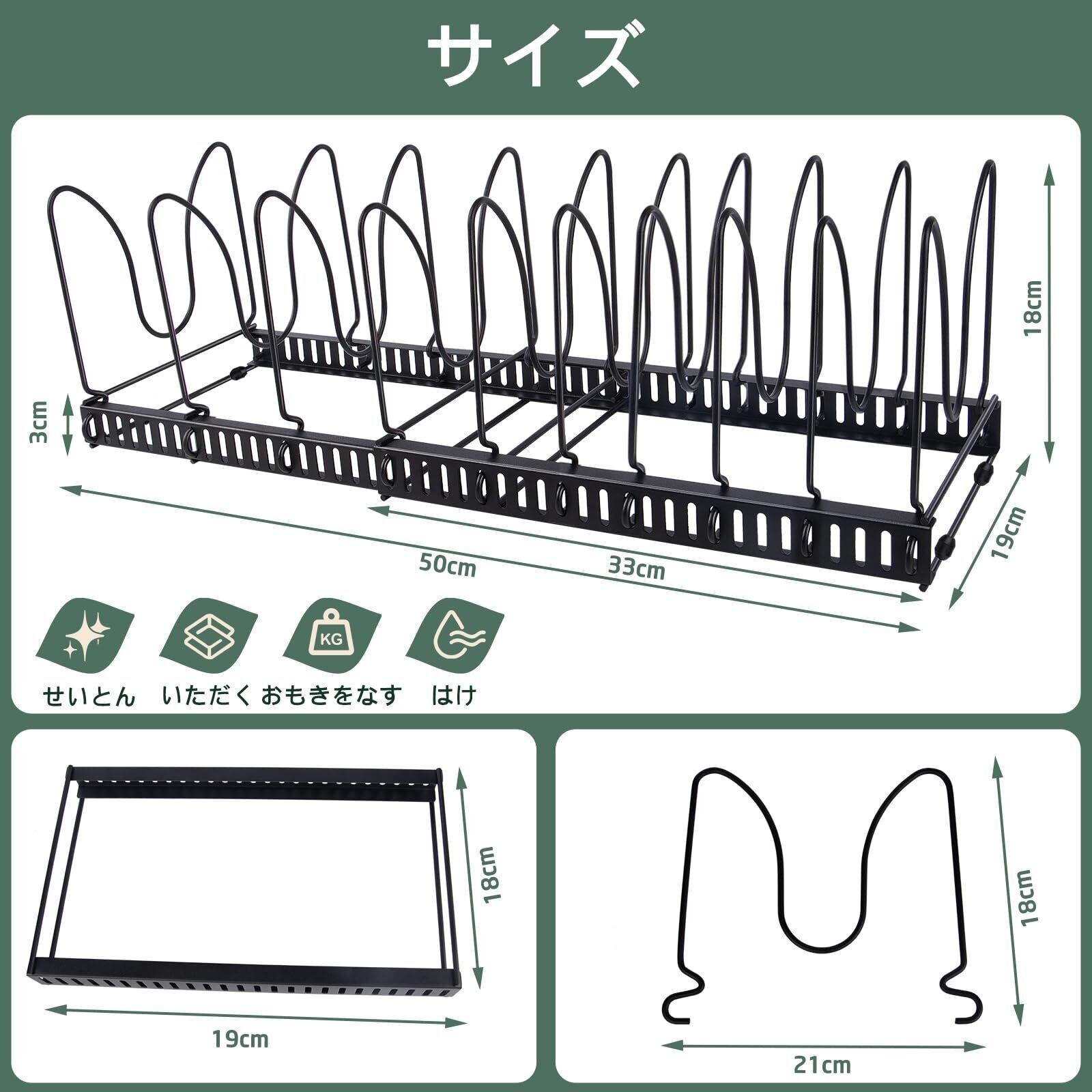 HOTOZON 鍋・フライパンラック 伸縮式 10本仕切りパーツ付き キッチン収納 シンク下/引き出し収納 簡単組み立て まな板・蓋置き対応 省スペース設計 (ブラック)
