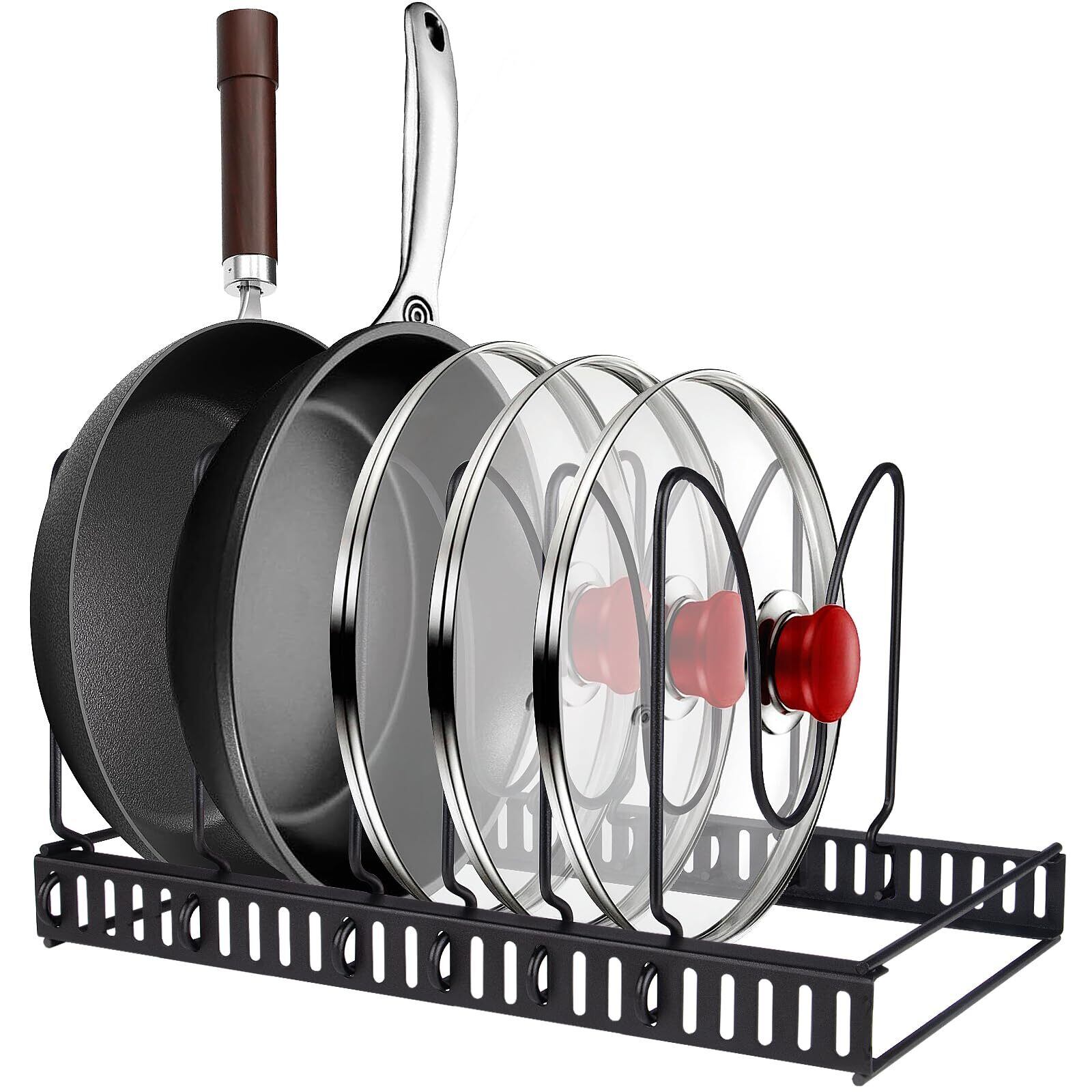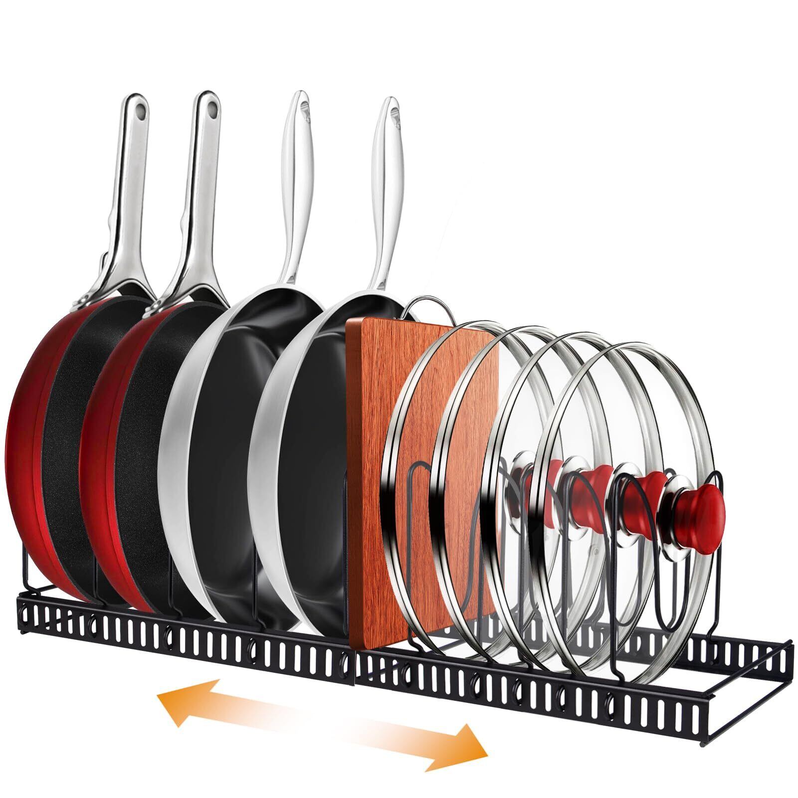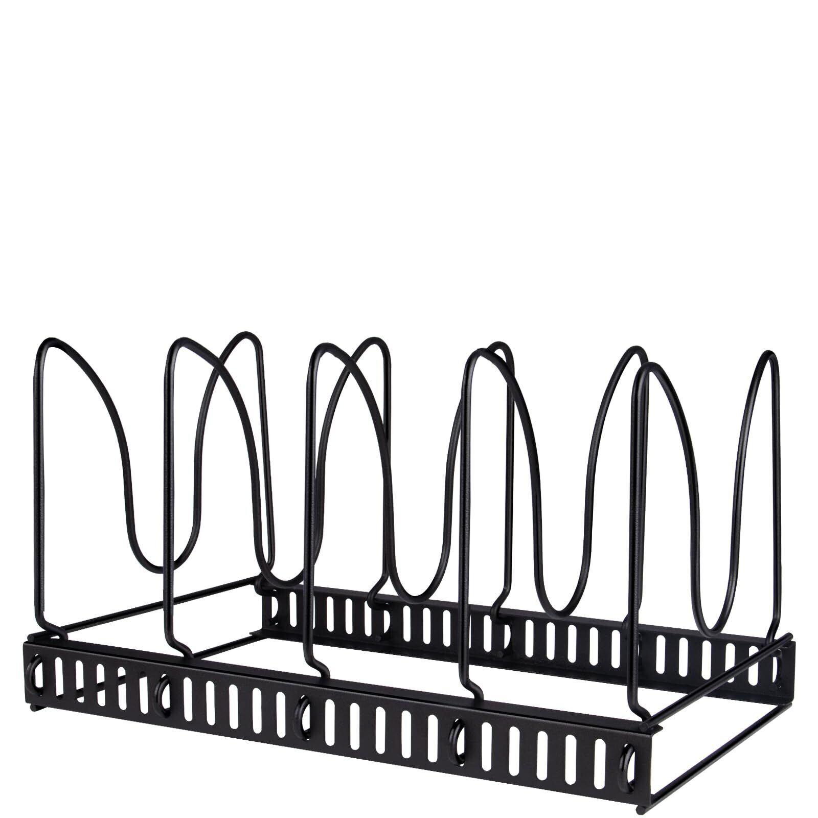 HOTOZON 鍋・フライパンラック 伸縮式 10本仕切りパーツ付き キッチン収納 シンク下/引き出し収納 簡単組み立て まな板・蓋置き対応 省スペース設計 (ブラック)