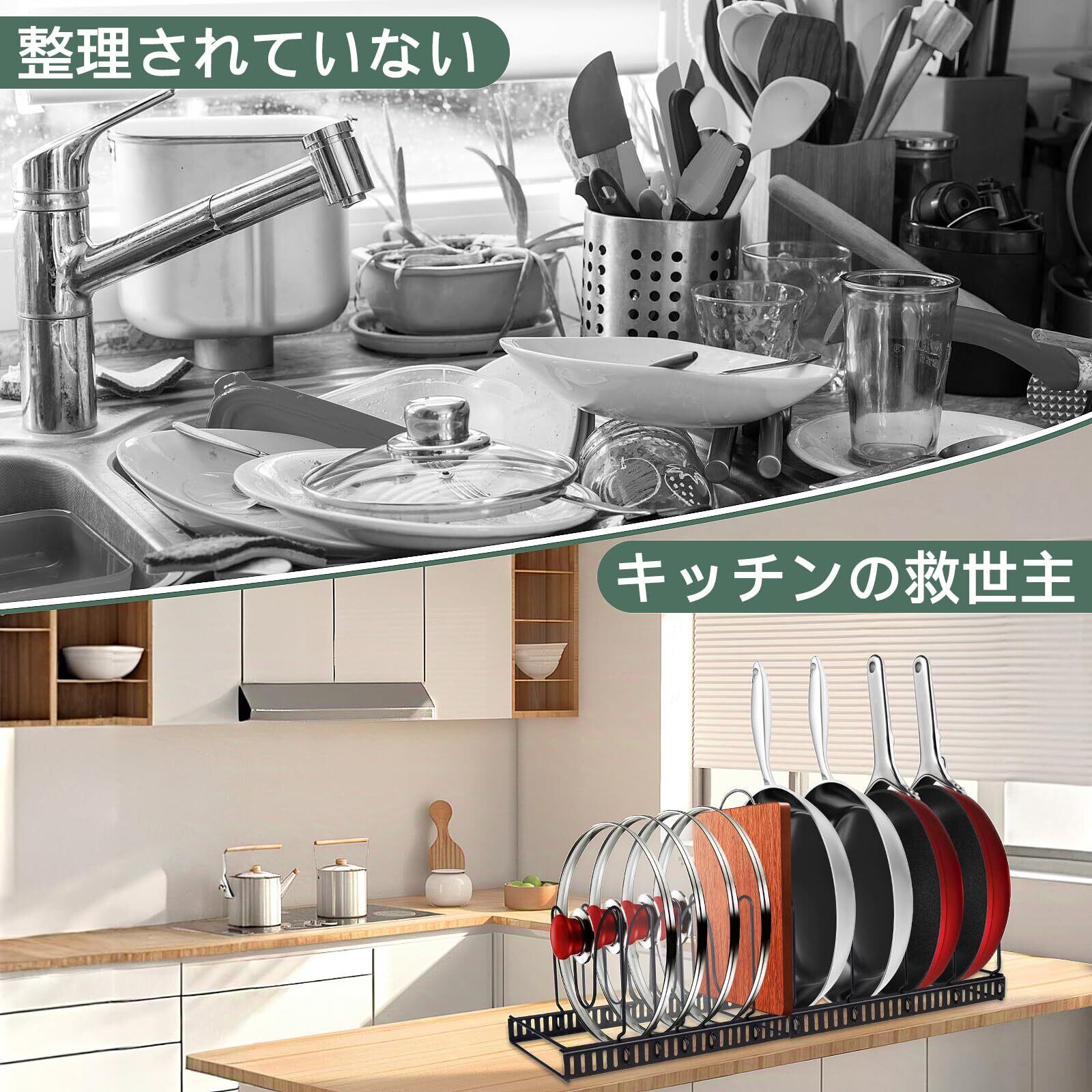 【仕切りでプロ級収納】 41~64cm無段階調節可能なフレームに、フライパン専用可動仕切りと鍋蓋/まな板固定トレーを10個装備。IHコンロ周りやシンク下の不規則なスペースでも、鋳物鍋から薄型クレープ鍋まで完璧整理。