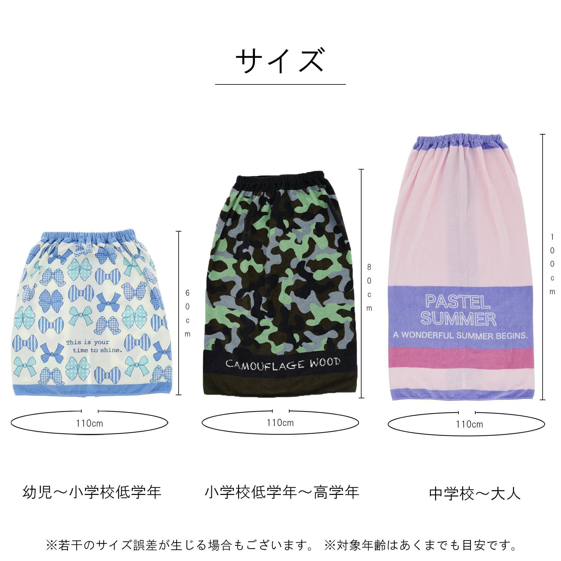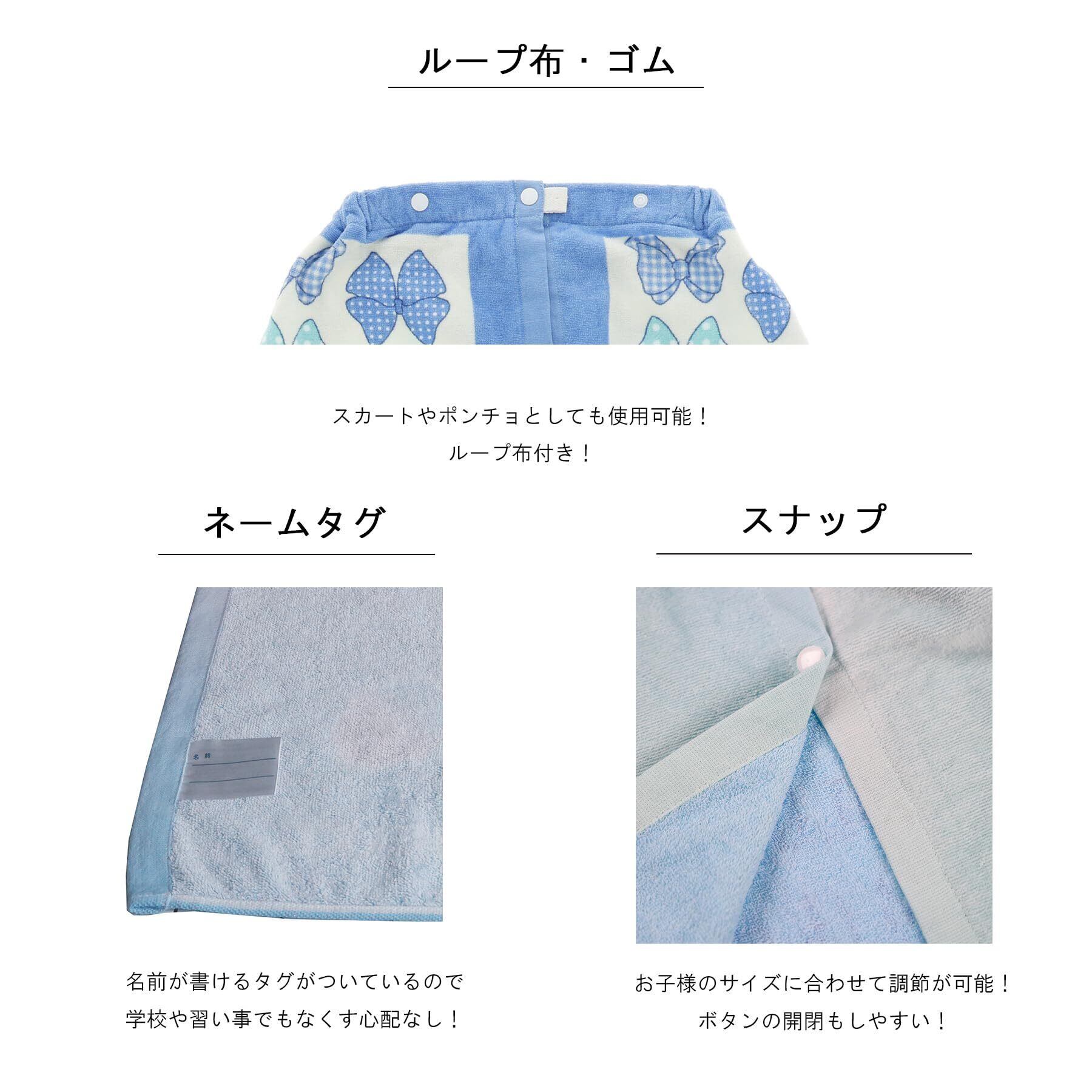 プールでのお着替えに便利な巻きタオル。スナップでサイズ調節が可能(丈は100cm)名前が書き込めるネーム付き