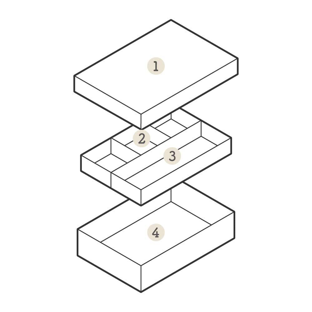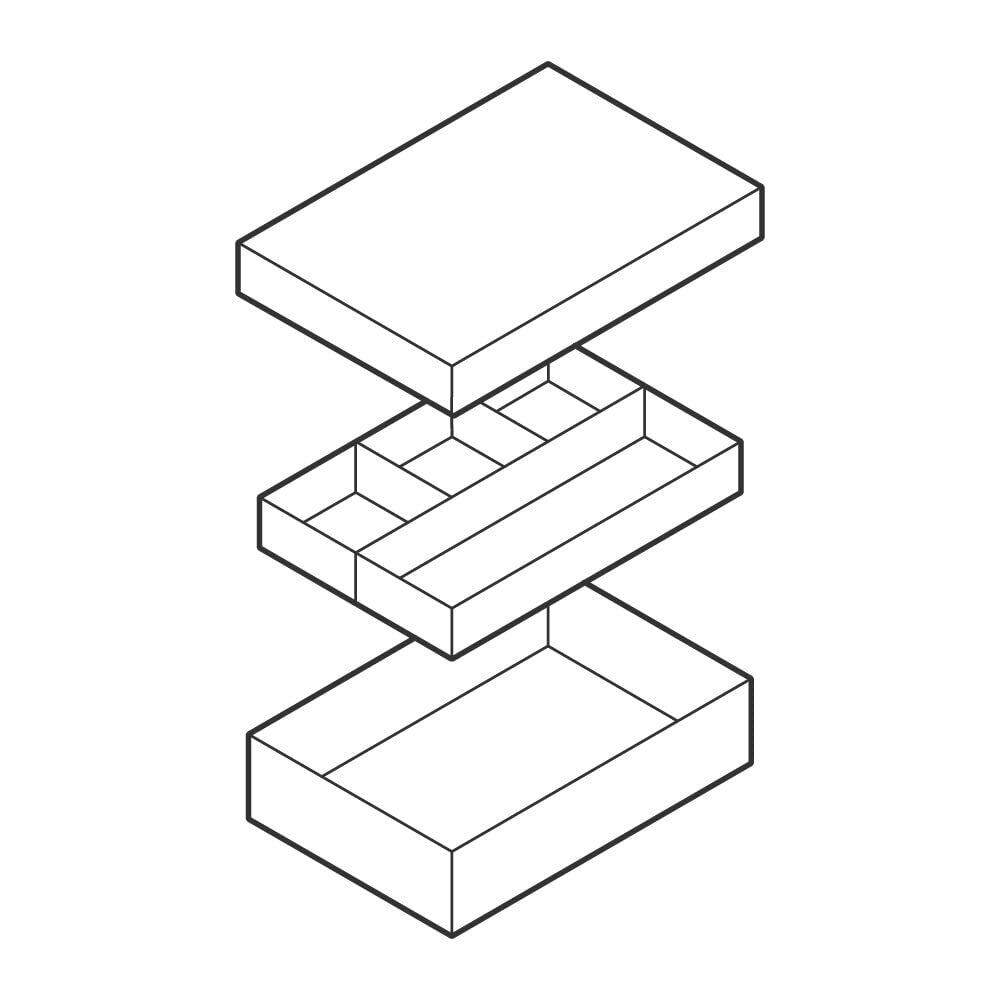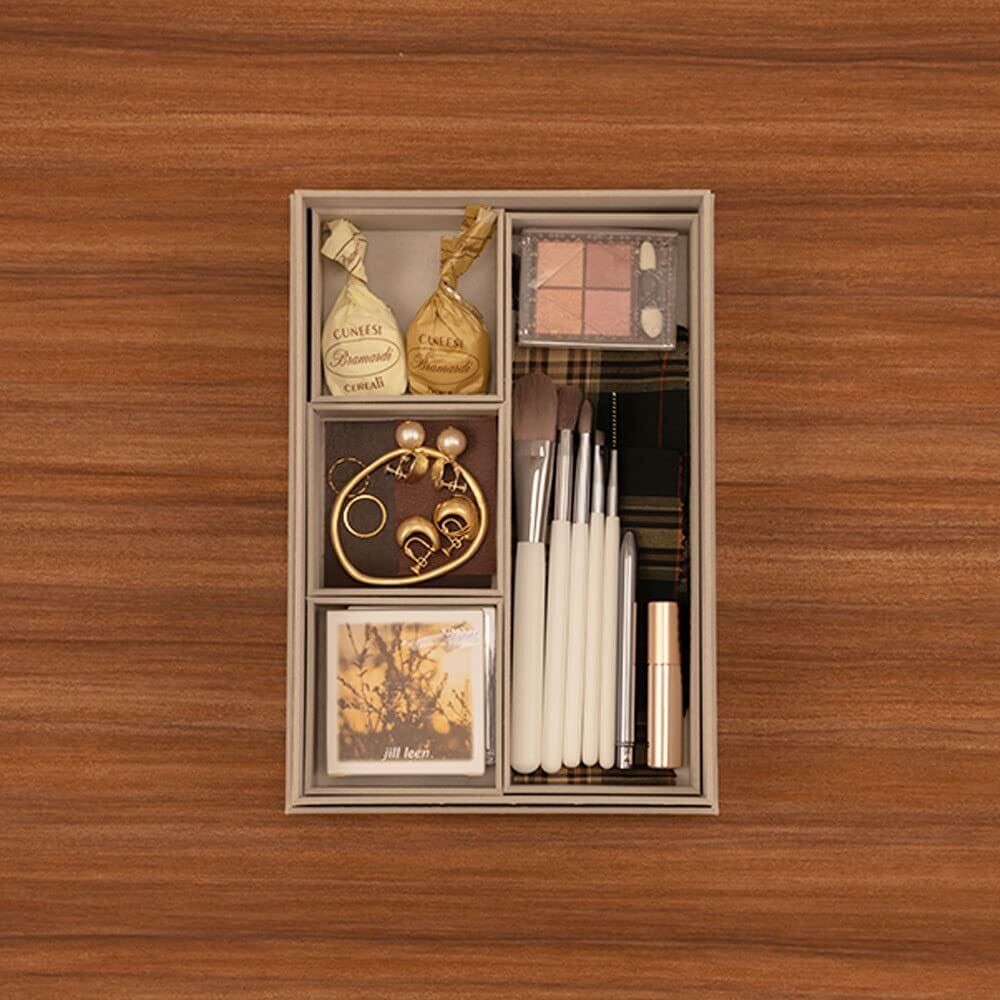 再生紙でつくった整理箱[retray (リトレイ)]。●デスクの上から引き出しの中までエッジのある洗練された美しい紙製整理箱。●~デスク周りから趣味の道具まで~デスク周りの文房具から趣味の道具まで、幅広い用途で整理・収納できます。ばらばらしがちな小物も小分けトレイを使うことで、一目でどこに何があるか確認できます。[文房具]手帳/メモ帳/ハガキ/筆記具/ハサミ/付箋/クリップ/マステ等…[ガジェット]マウス/ブルーライトカットメガネ/充電器/USB/イヤホン/コード類等…[化粧品]アクセサリー/ファンデーション/化粧筆/リップ等…[裁縫道具]布/裁ちばさみ/定規/ロータリーカッター/針/糸/ボタン/ピンクッション等…。●本製品は、古紙パルプ配合率100%の再生紙を使用しています。●引き出しにも入るサイズ感です。ごちゃごちゃしがちな引き出しの中もすっきり整理できます。※高さ40mm(内寸)以上の引き出しにご使用できます。●小分けトレイは、卓上収納としてもお使いいただけます。仕事や趣味でよく使うものを収納でき、作業効率アップに繋がります。