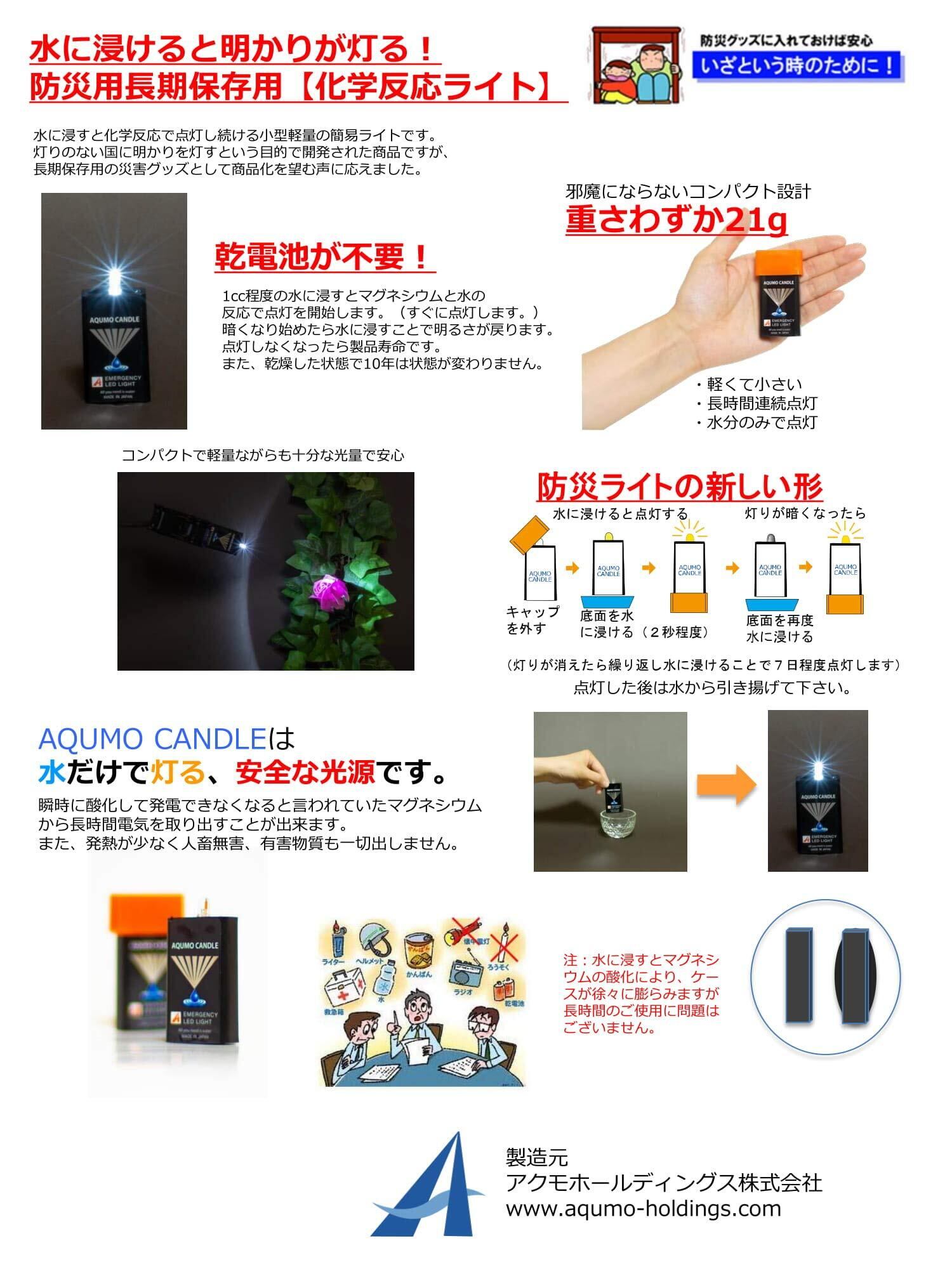 【使用方法】 約1ccの水で点灯します。2~3日連続点灯、繰り返しの使用可能で1週間以上使用できます。蓄電効果もあり、LED点灯が安定しています。