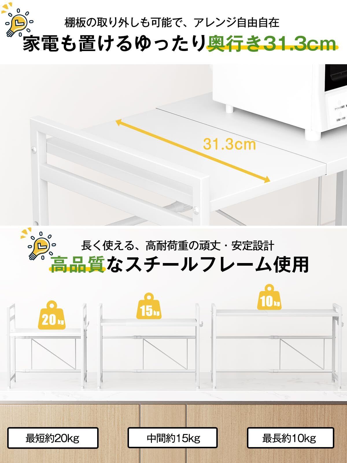 【耐荷重能力が強い】伸縮式ラックの耐荷重は約15-50Kgで、幅により異なります。最小幅39㎝の場合、耐荷重は約50Kg、最大幅65㎝の場合、約15Kgです。トースターや、ポット、コーヒーメーカーなど普通の小電気製品や鍋も棚板の上に置いて、棚板の変形や壊れ等の心配なくて安定です。安心にご使用できます。