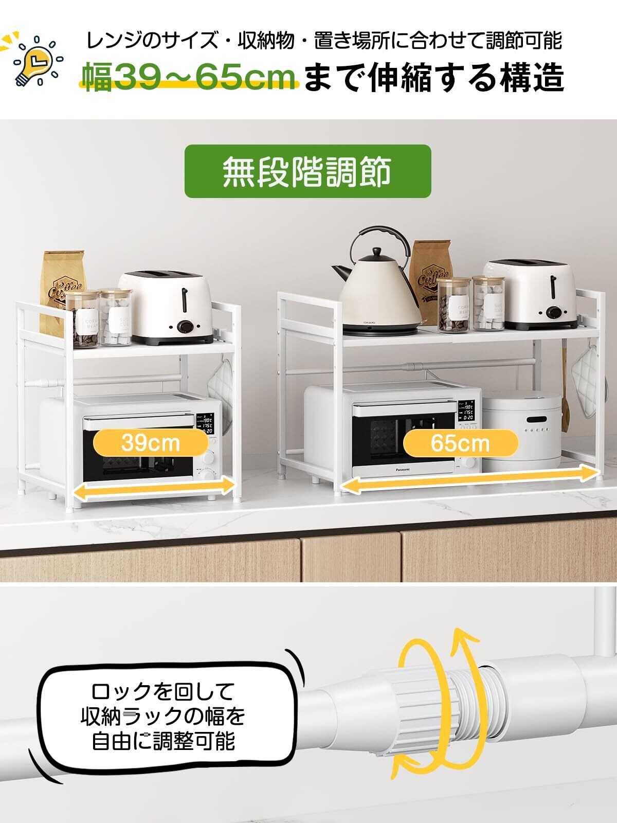 TKUIN レンジ上ラック キッチン 伸縮式 トースターラック 幅(39-65cm) 伸縮可 オーブンレンジ 棚板高さ調節可 電子レンジ 台 収納 耐荷重50kg フック4つ付き 組み立て簡単 おしゃれ (ホワイト)