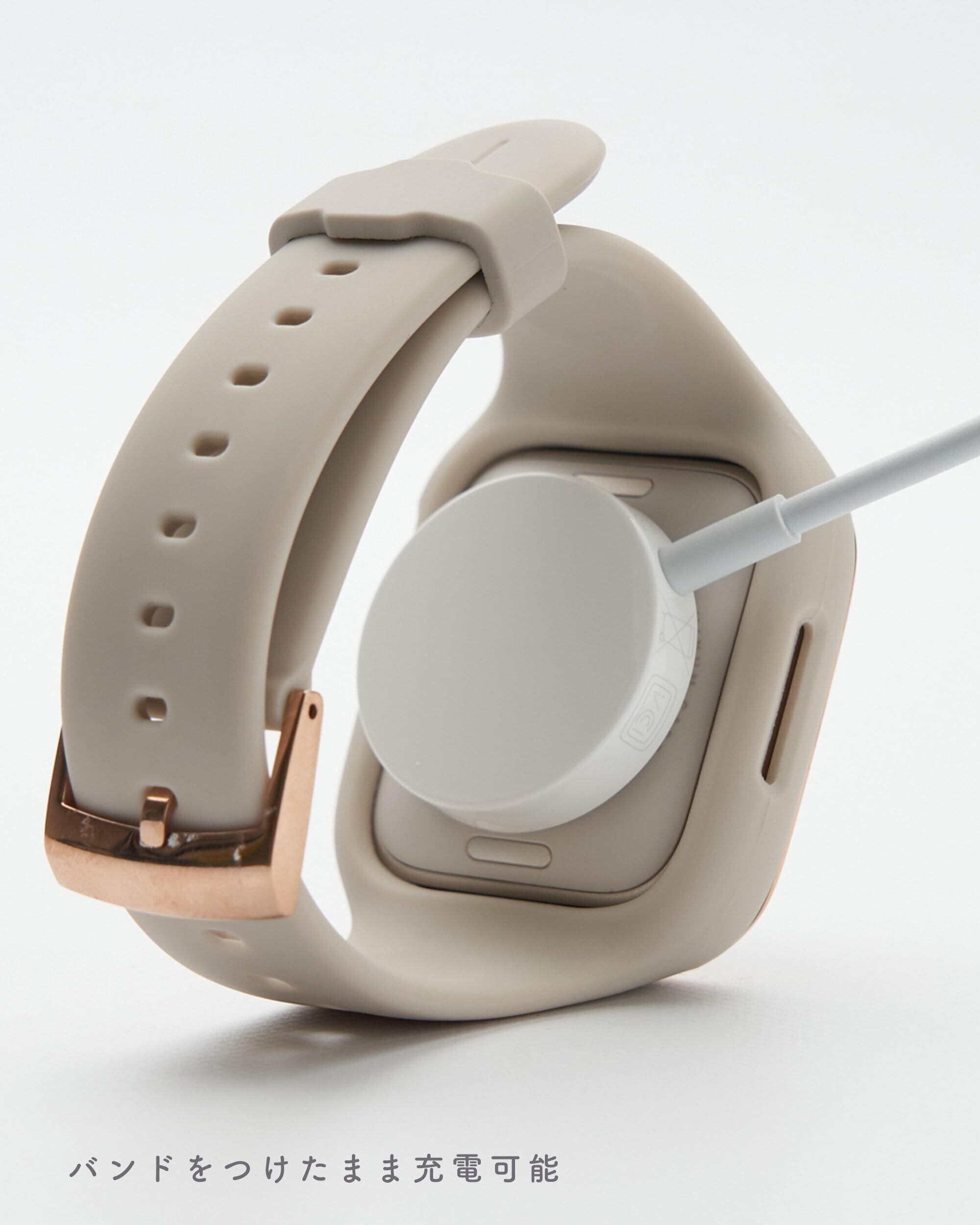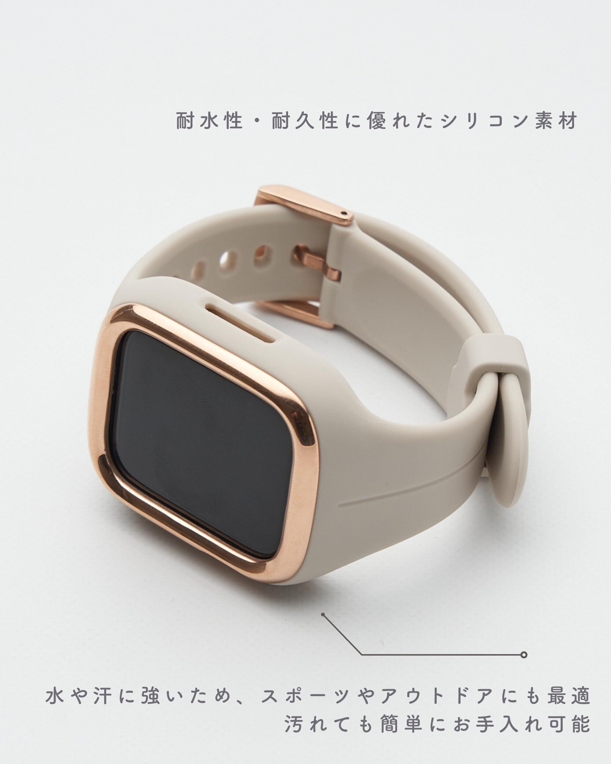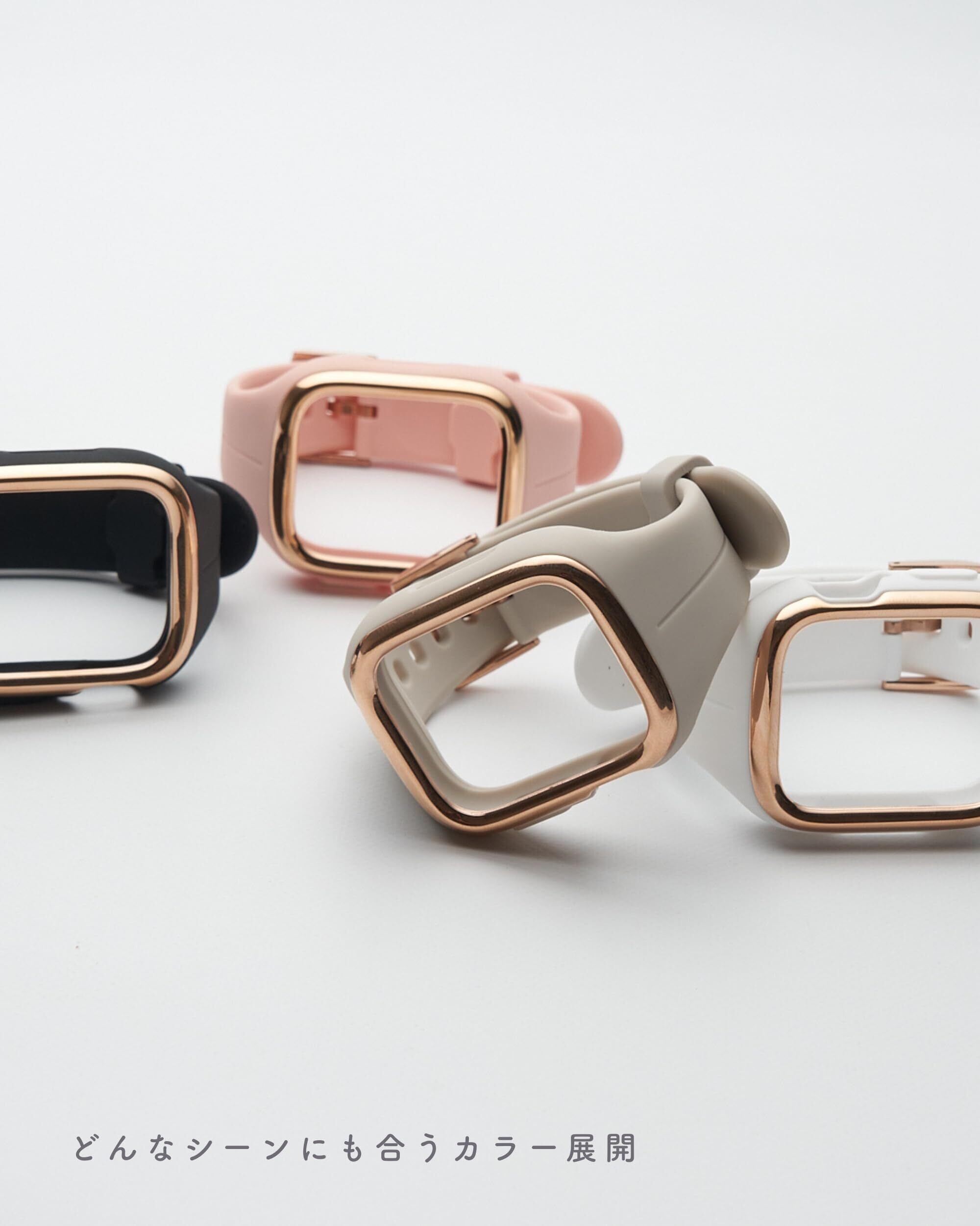 【ゴールドラインがアクセントの一体型バンド】カジュアルなイメージがあるシリコン素材ですが、本体周りを囲むゴールドラインをデザインに起用しバンドに高級感をプラス。ゴールドラインがくすみカラーと調和し、エレガントで洗練された印象に仕上げました。女性の腕周りに馴染む一体型のデザインをコンセプトに、なめらかな曲線を描いたデザインを採用。使いやすさはもちろん、洗練されたデザインでカジュアルからフォーマルなシーンまで場面を選ばずお使いただけます。