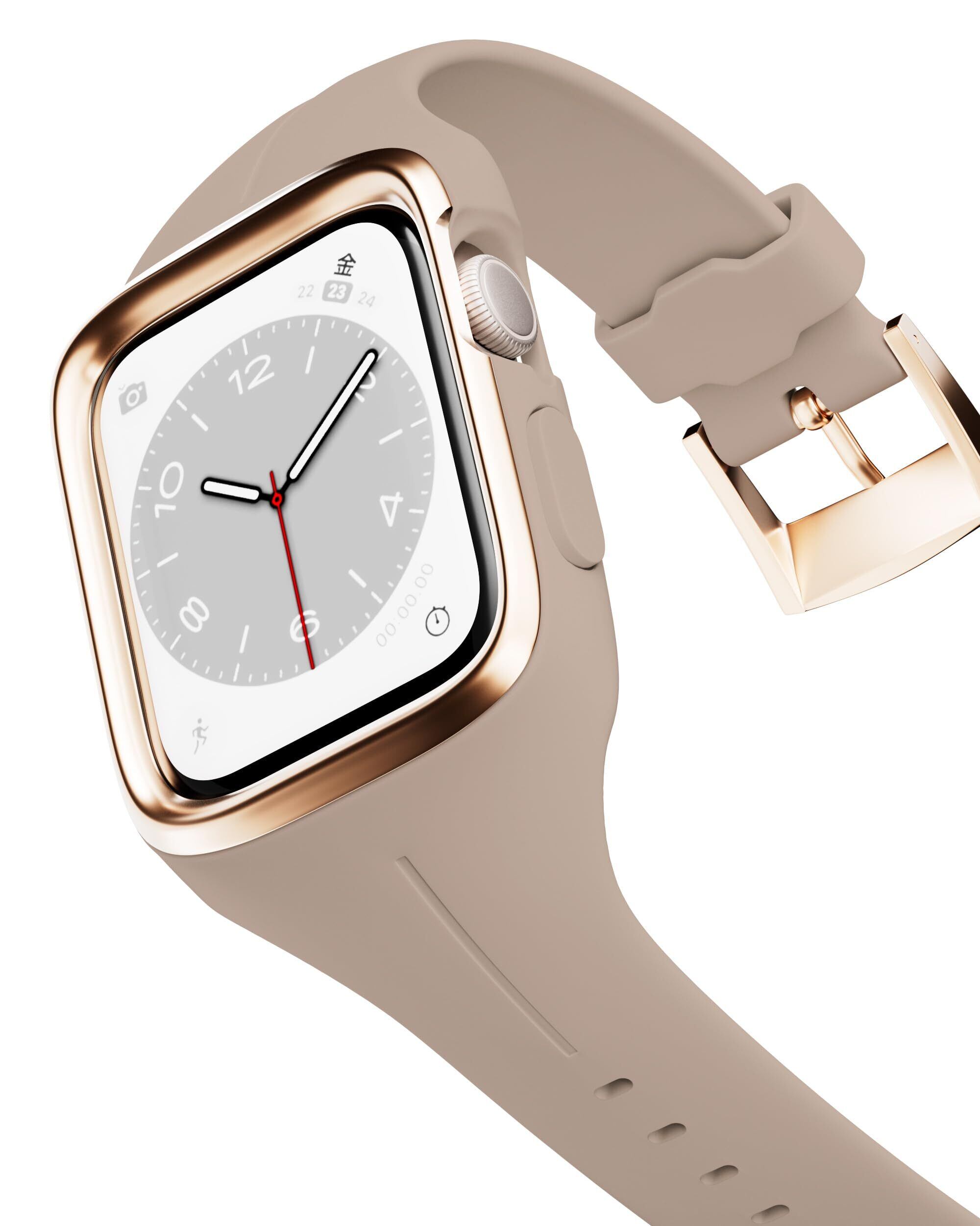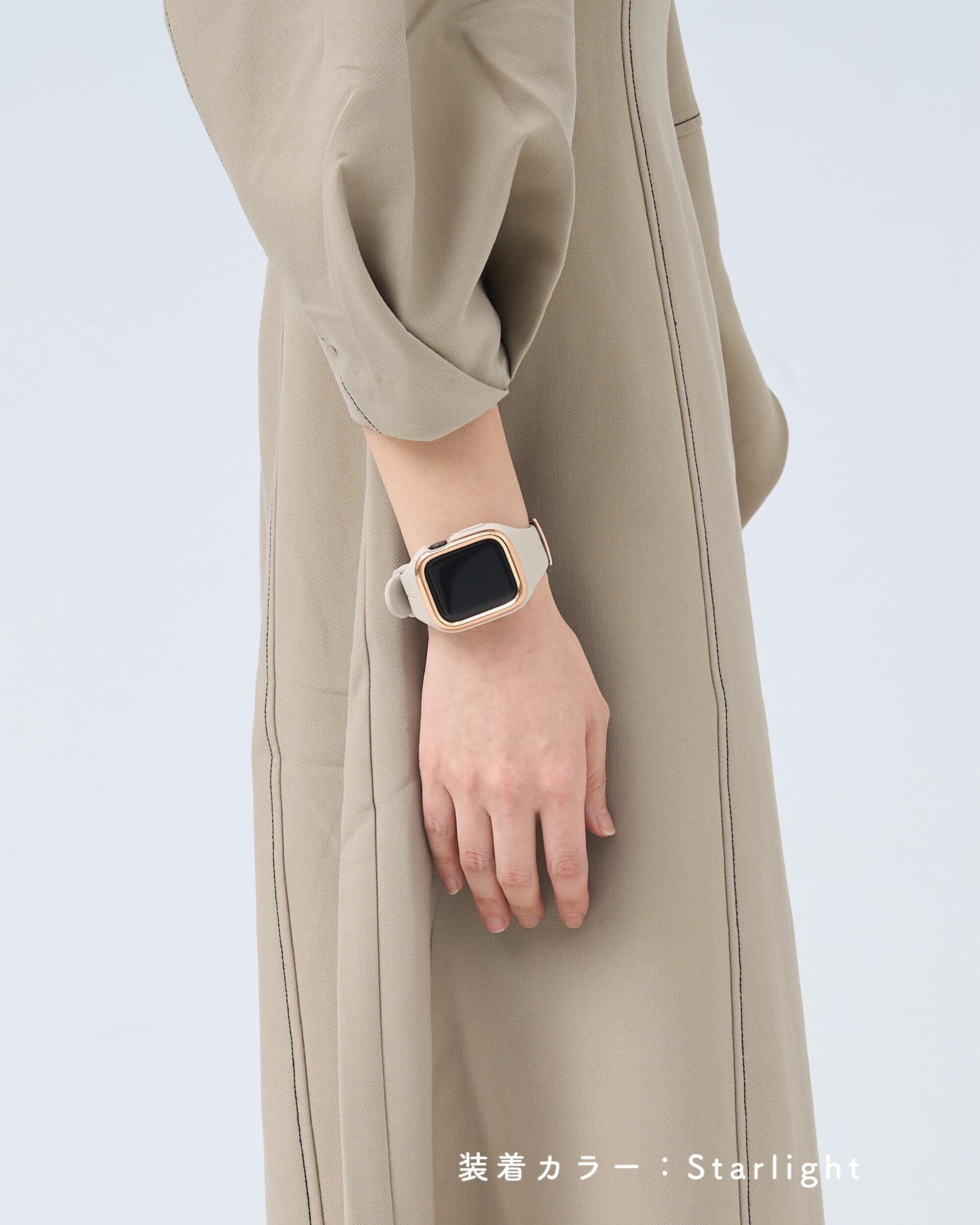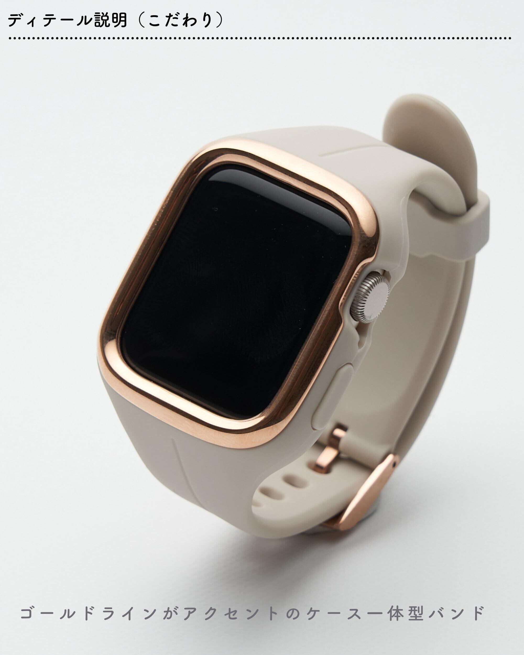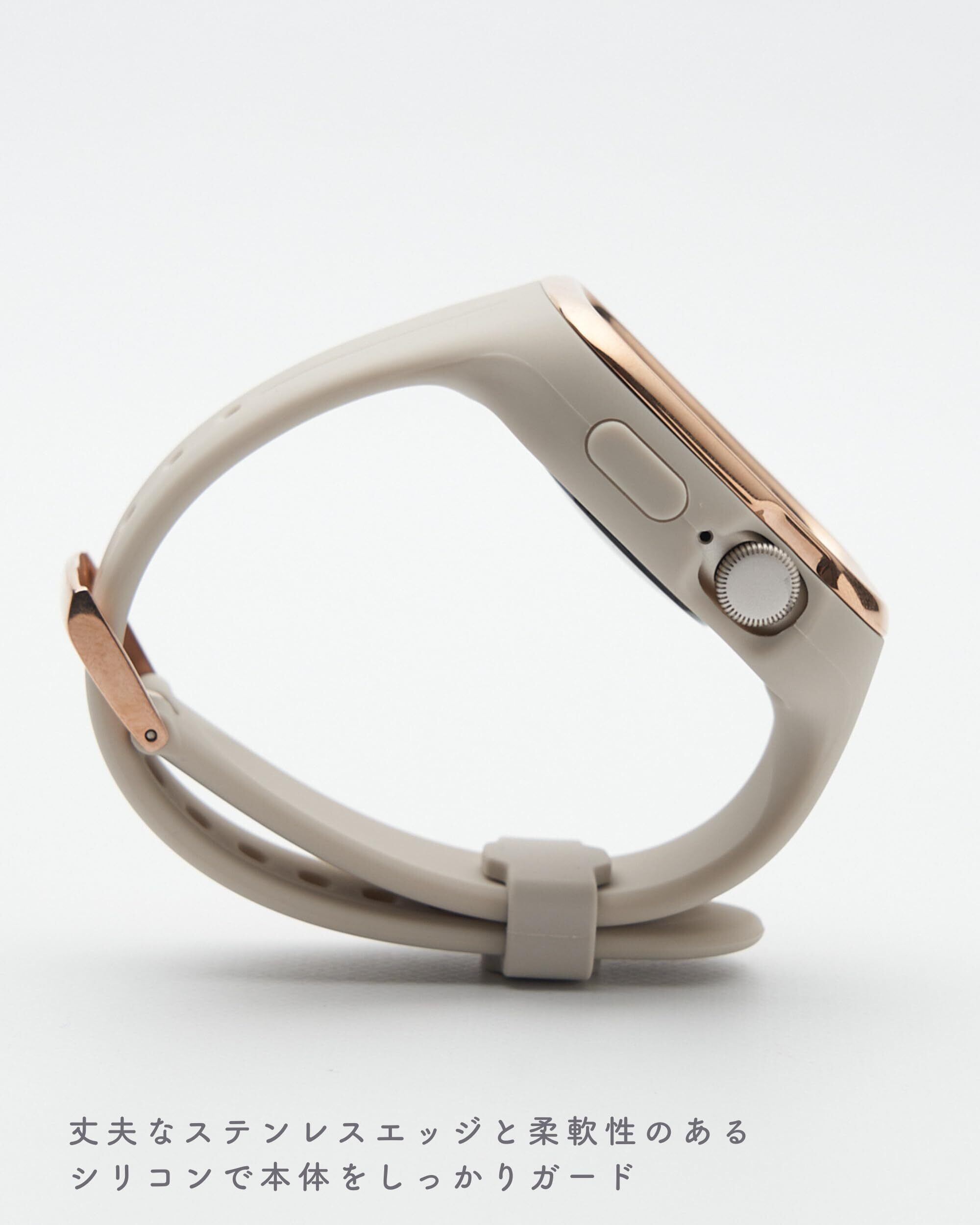 【本体をしっかりガードし充電も楽々】バンドとケースが一体化しているため、丈夫なステンレスエッジと柔軟性のあるシリコンでApplewatchを衝撃から守ってくれます。シームレス仕様になっているので洗練された印象に。女性の細い腕周りを優しく包んでくれるデザインに仕上げました。バンドを付けたまま充電も可能、デザインだけではなく実用性にも優れた一体型バンドです。