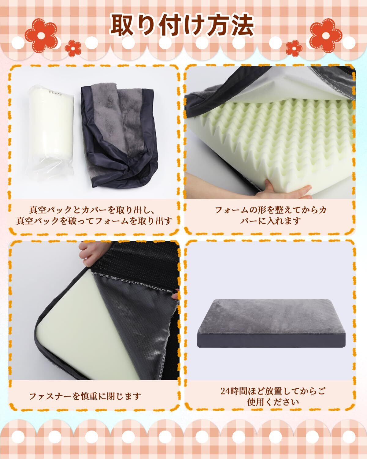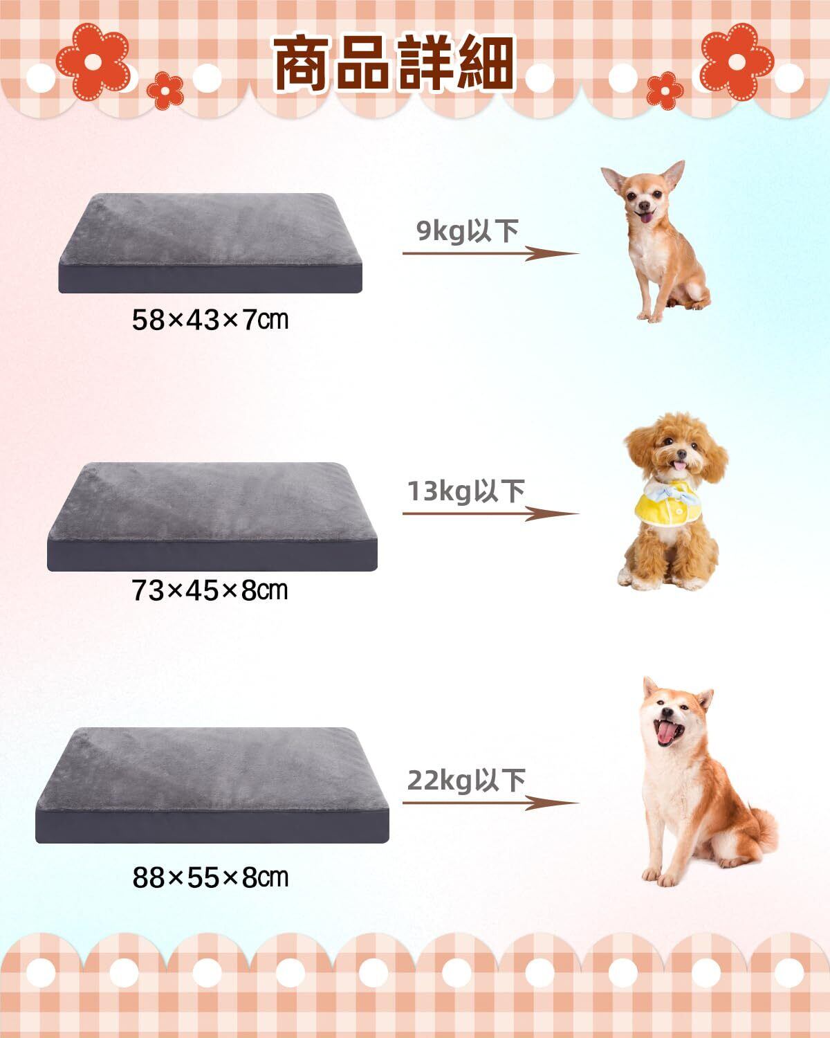 【サイズ&ご注意】パッケージ内容:エッグクレートフォーム×1、カバー×1、取扱説明書×1。犬ベッドのウレタン(スポンジ)は58×43×8cmで、カバーは58×43×7cmです。運送しやすいために、ペットベッドのウレタンフォームが圧縮状態でお届けしますので、開封後に24時間ほど放置してからカバーに入れてご使用ください。商品が到着時に万が一破損・汚損また使用中に何らかの不具合などがございましたらお気軽に問い合わせください。