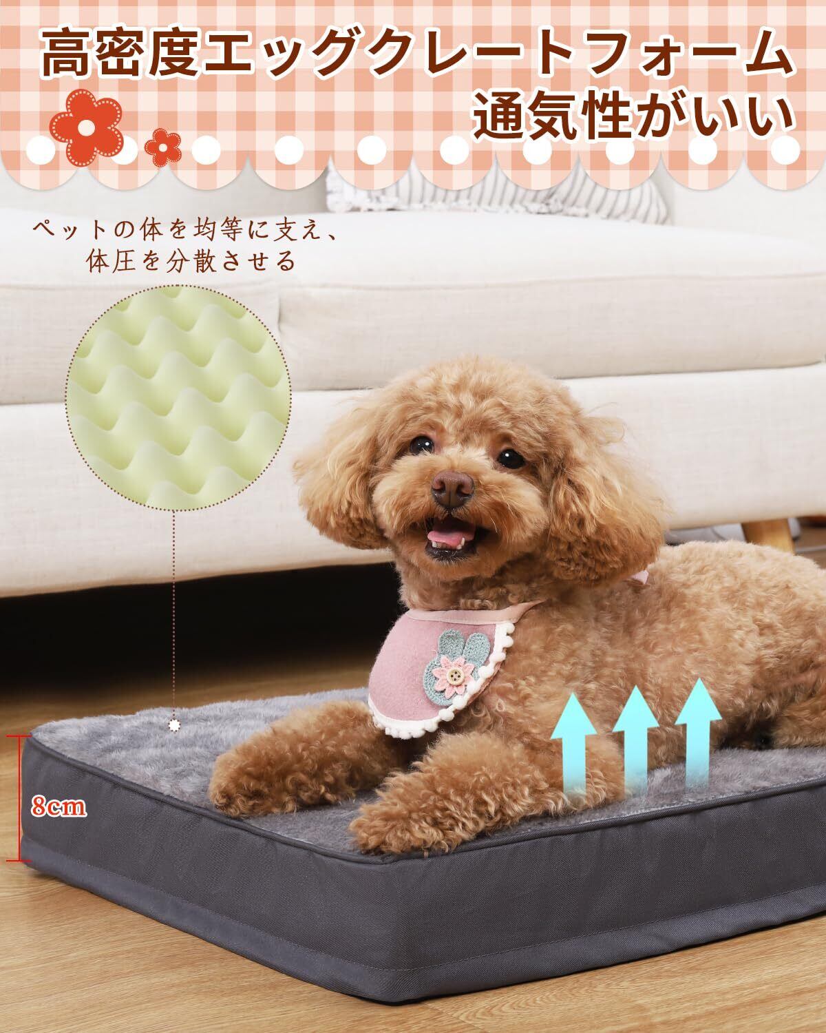 【高反発ペットベッド】犬ベッドの中には厚さ8cmの高密度エッグクレート・フォームで、凹凸の点で体を支えて、体圧分散が均等に行われ、高齢犬や子犬などにオススメです。長時間使用しても型崩れしなく、猫やその他の小動物用クッションとしても使えがあるペットが快適に休むことができるペットベッドです。