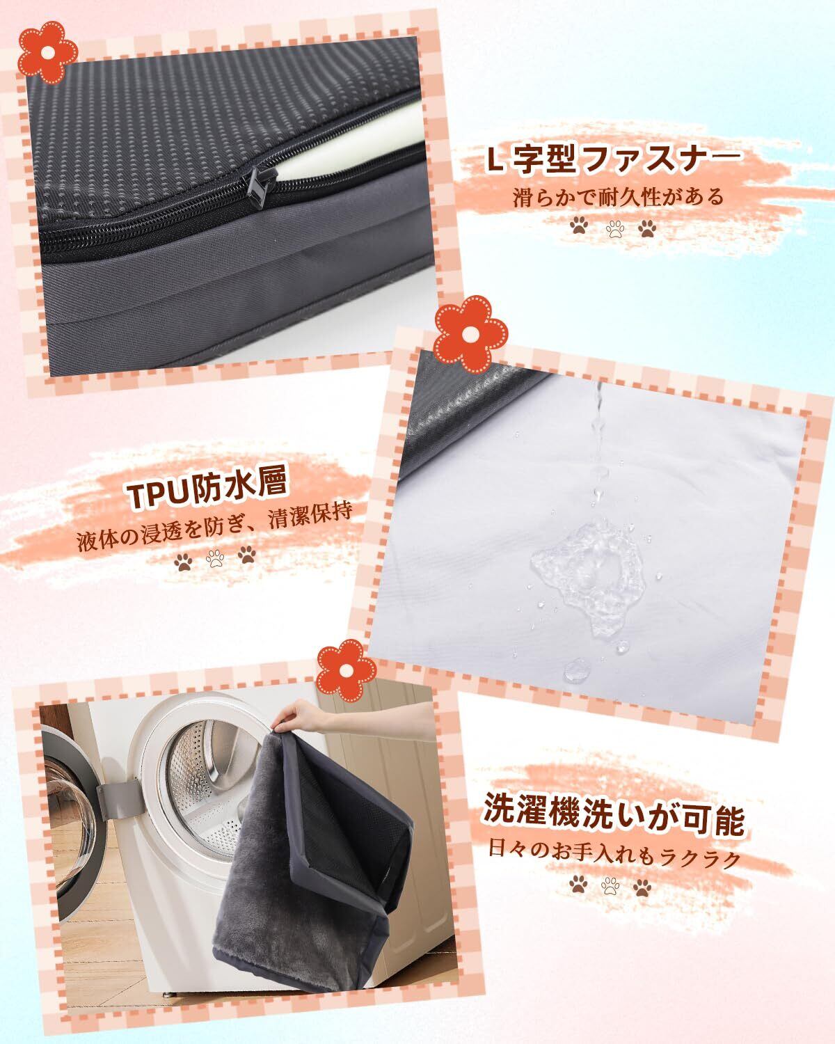 【洗える取り外し可能なカバー】犬ベッドは柔らかい短毛生地で、TPU防水層と織物の裏地で肌ざわりの良い3層の複合生地を採用し、より強く耐久性があります。犬ベッドのカバーは滑らかなL字型ファスナーが付き、取り外しが超簡単。カバーは手洗いと洗濯機洗いが可能で、素早く掃除でき、手間がかかりません。犬ベッド中身のスポンジは洗えませんのでご注意ください。