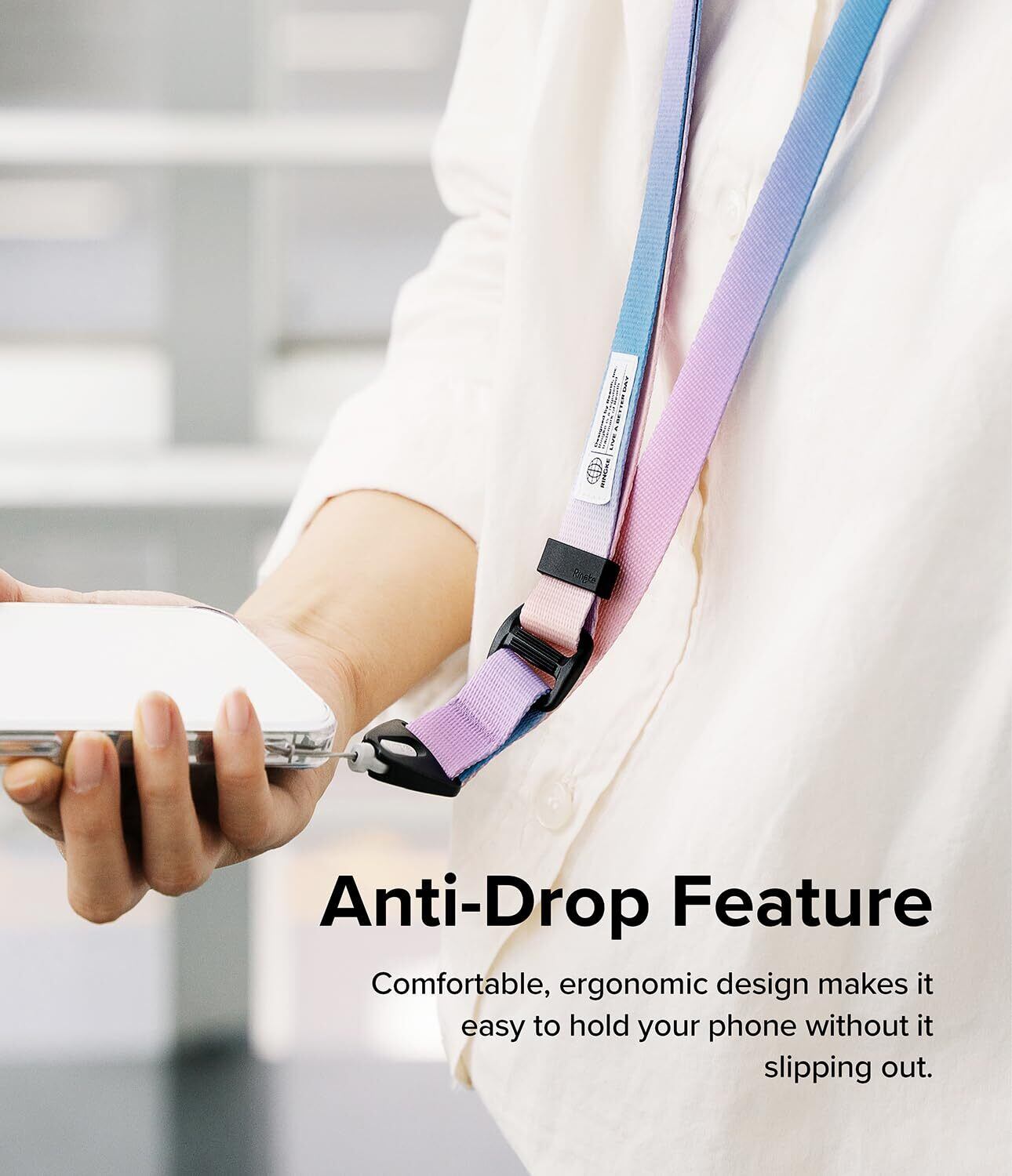 【Ringke Design Neck Lanyard Strap】ナイロンとポリエステル高級素材で作られ、毛羽立ちにくく、製織技法製造で変形ない優れたデザインを誇ります。