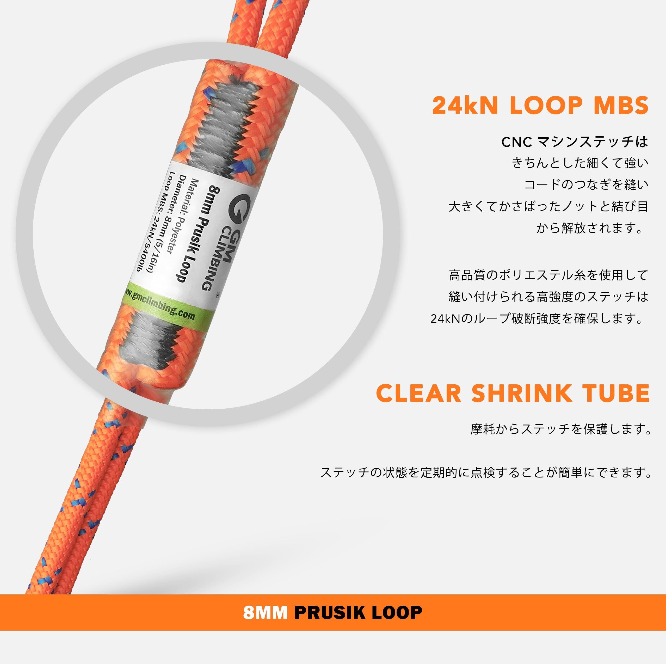 GM CLIMBINGの8mmプルージックループは、ダブルブレード構造のアクセサリーコードにより製造され、耐摩耗性と耐久性に優れ、高強度を持ちます。