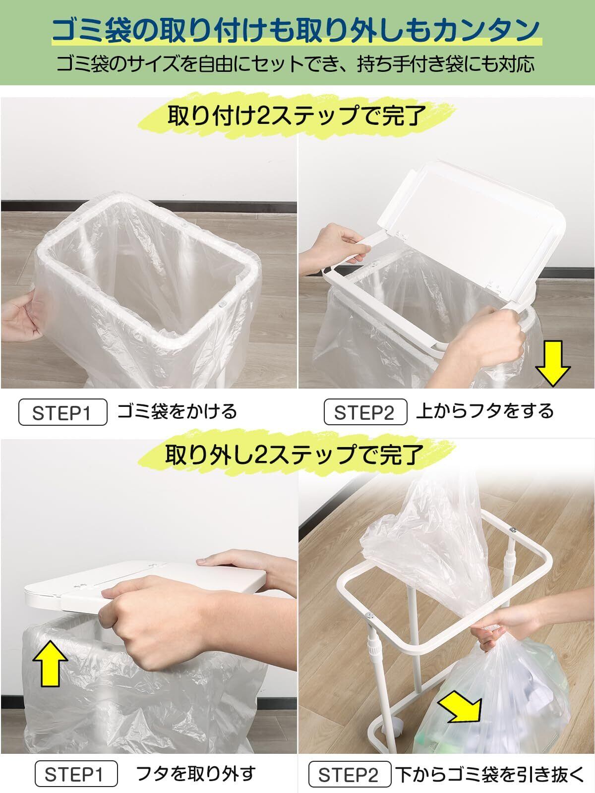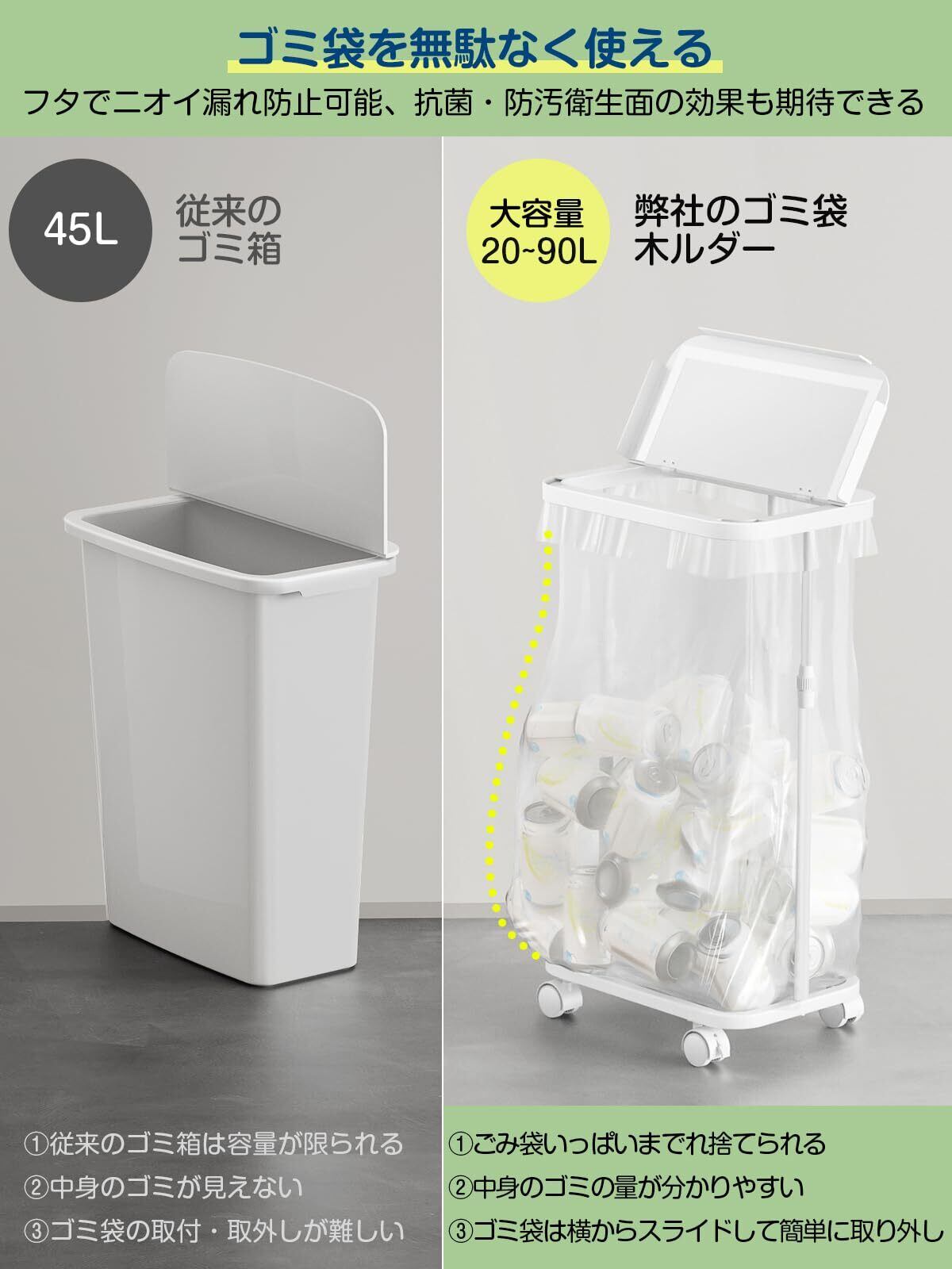 【確認しやすい・使いやすい・お手入れも楽々】袋の中身が見え、どれだけゴミが溜まったか確認しやすい。袋状のものや袋状になるものならほとんどのものがゴミ袋として使えます。ゴミががいっぱいになって膨れても、蓋を通さずに大きく開いた側面からゴミ袋を取り出せるのでとても楽です。ゴミ箱との違いは省スペースなことと、側面や底面が汚れないこと。
