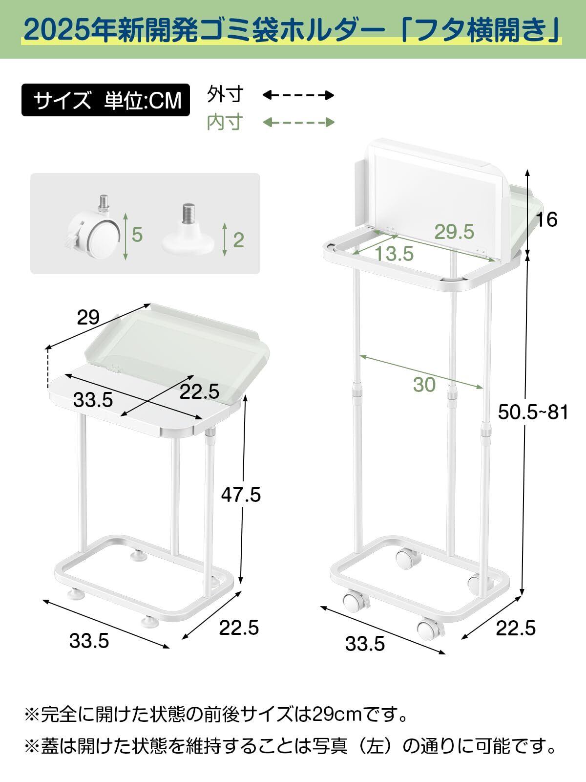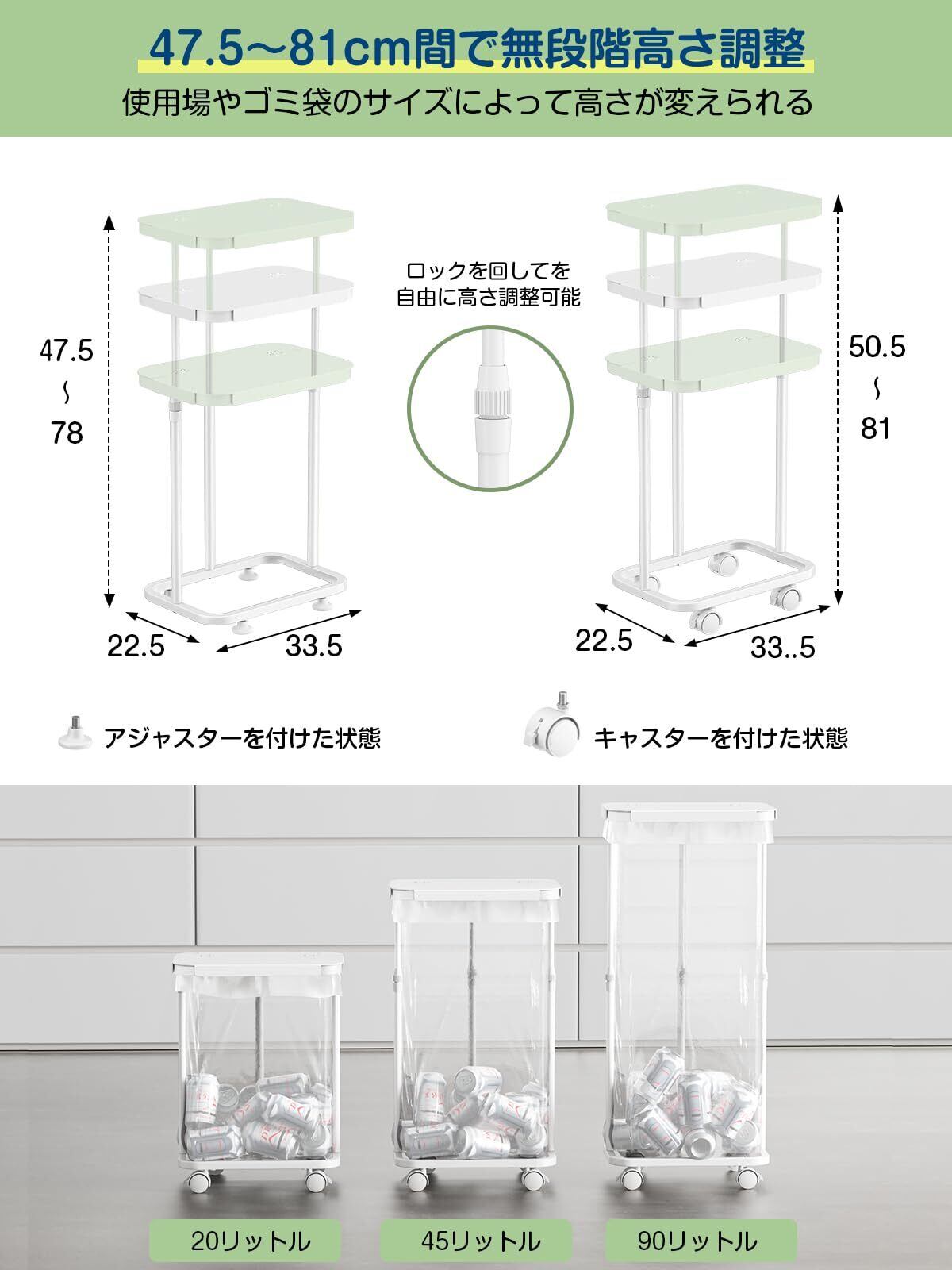 【ゴミ袋ホルダーフタ付き仕様】キャスター付きサイズ:約W33.5×D22.5×H(50.5~81)cm/アジャスター付きサイズ:約W33.5×D22.5×H(47.5~78)cm ◎重量:約2.2kg ◎材質:スチール(紛体塗装)◎対応ゴミ袋:20L~90L。ペットボトルや空き缶やプラスチックゴミなどの分別に便利なポリ袋ホルダー。