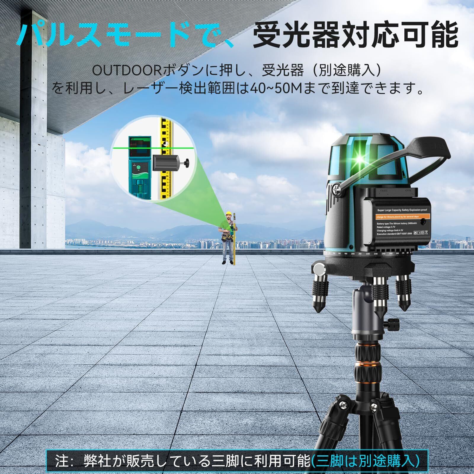 【高輝度・高精度・高機能】垂直ライン4本、水平ライン1本、5ドット。赤色よりも視覚的に見やすいとされる緑色のレーザーを採用していて、パルスモードもあり、受光器(別売り)と組み合わせて使用する場合は、レーザー検出範囲は50~60Mまで到達し、室外でも作業できます。️丈夫な収納ケースが付き、持ち運びが便利で、作業現場に行く時に利用できます。️現場作業に耐える高い防塵・防滴性能 IP54仕様で、ちょっとした雨の日、荒れた環境のところでも問題なく使用していただけます。レーザー基準:クラス2、出力1mW未満。
