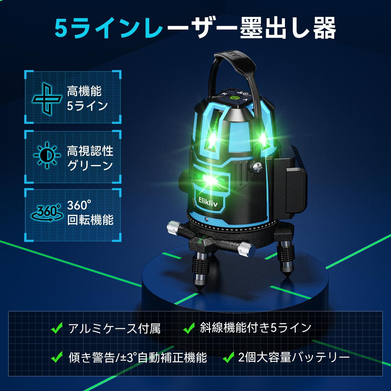 【2025年新登場】 Elikliv レーザー墨出し器 レーザー 水平器 レーザーレベル 5ライン グリーン 回転レーザー線 5線6点 4方向大矩照射 360°微調整 墨出しレーザー DIY 自動補正 高輝度 高出力 軽天作業 照射 地墨ポイント 屋内 屋外 大容量2個バッテリー・ケース付き 型番:B5