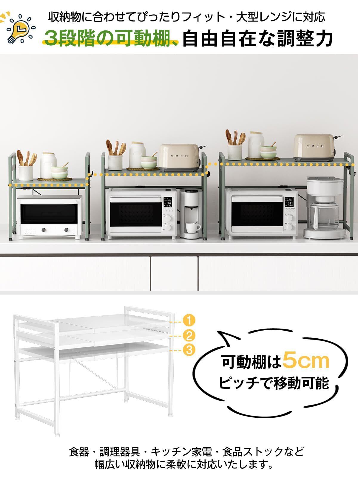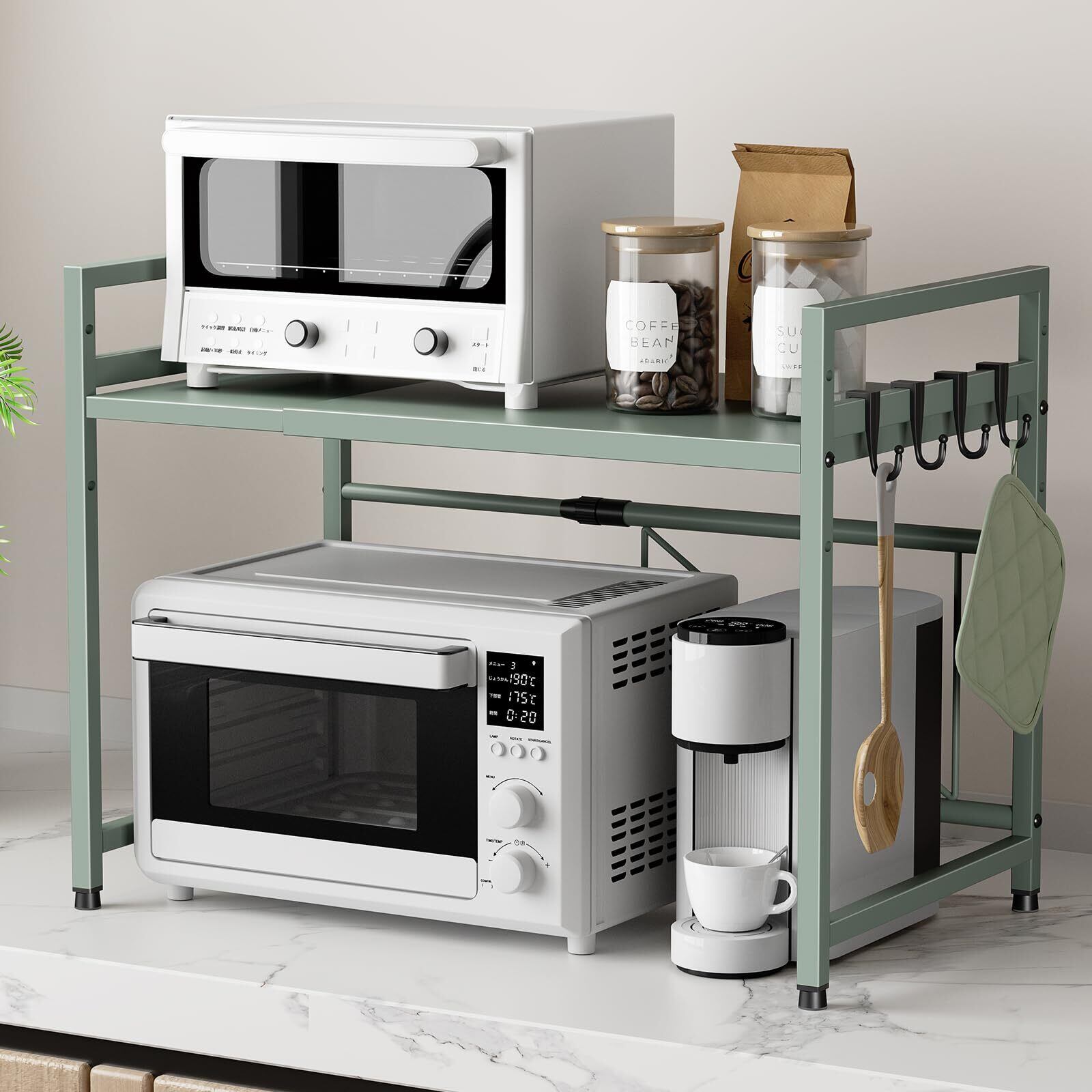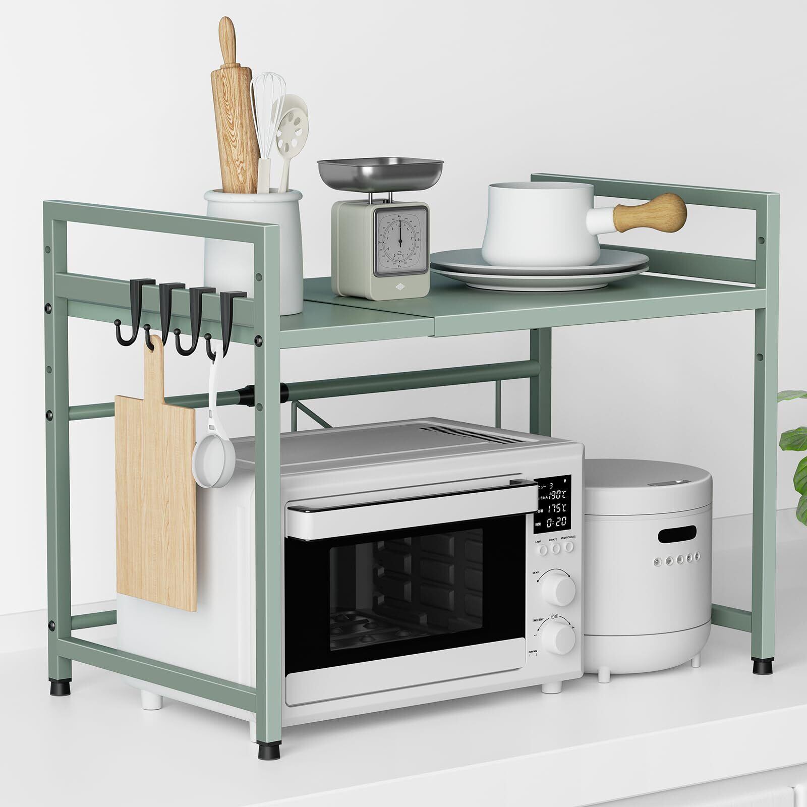 TKUIN レンジ上ラック キッチン 伸縮式 トースターラック 幅(39-65cm) 伸縮可 オーブンレンジラック 棚板高さ調節可 電子レンジ 台 収納 耐荷重50kg フック4つ付き 組み立て簡単 おしゃれ (グリーン) | BASE SHOP