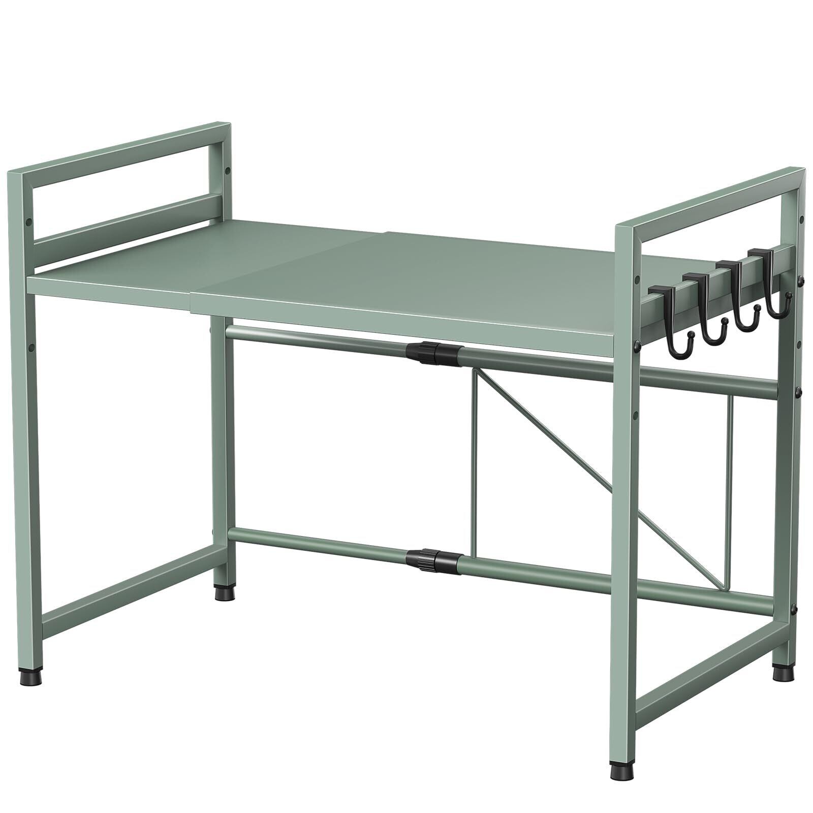 TKUIN レンジ上ラック キッチン 伸縮式 トースターラック 幅(39-65cm) 伸縮可 オーブンレンジラック 棚板高さ調節可 電子レンジ 台 収納 耐荷重50kg フック4つ付き 組み立て簡単 おしゃれ (グリーン)