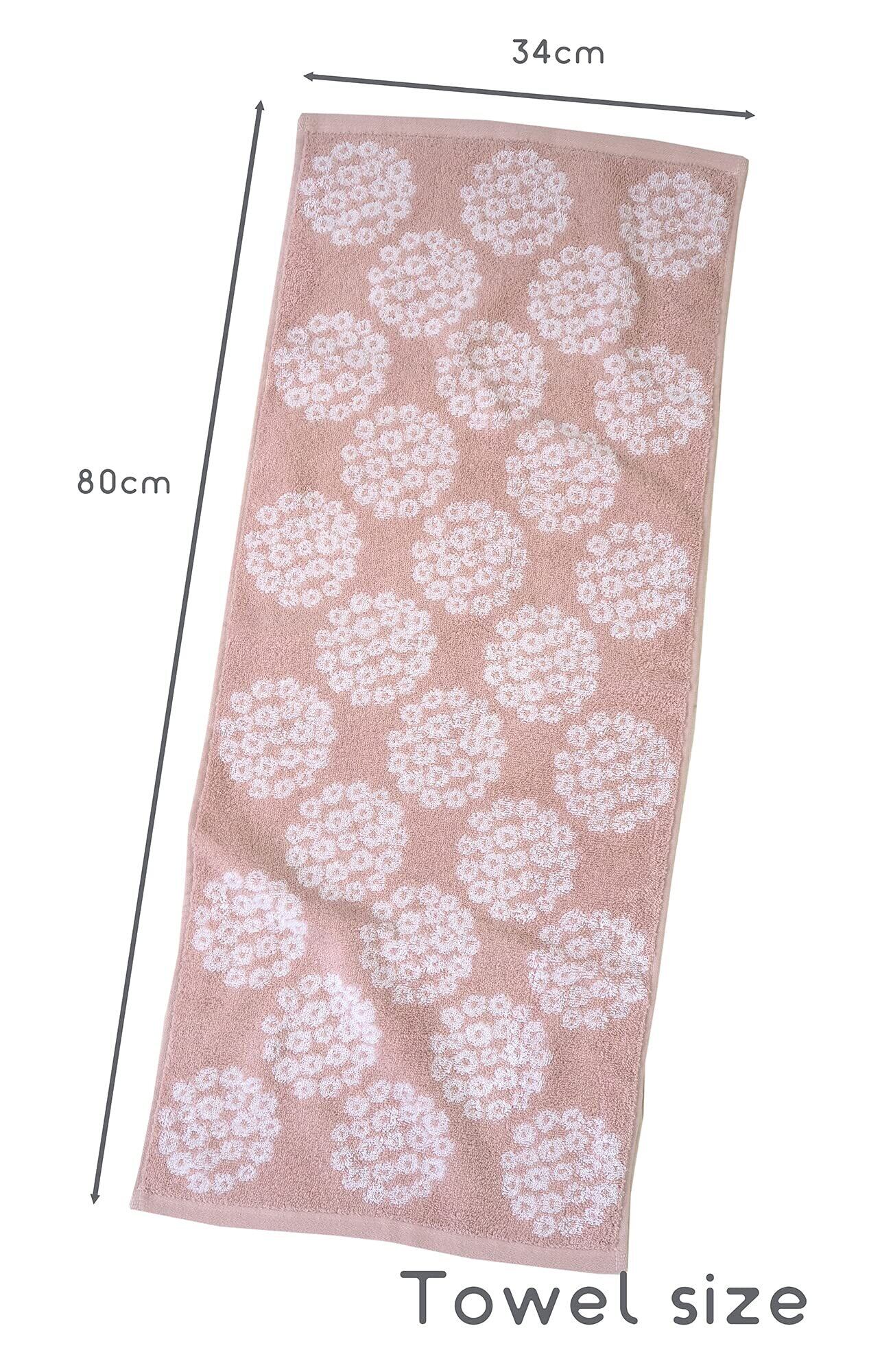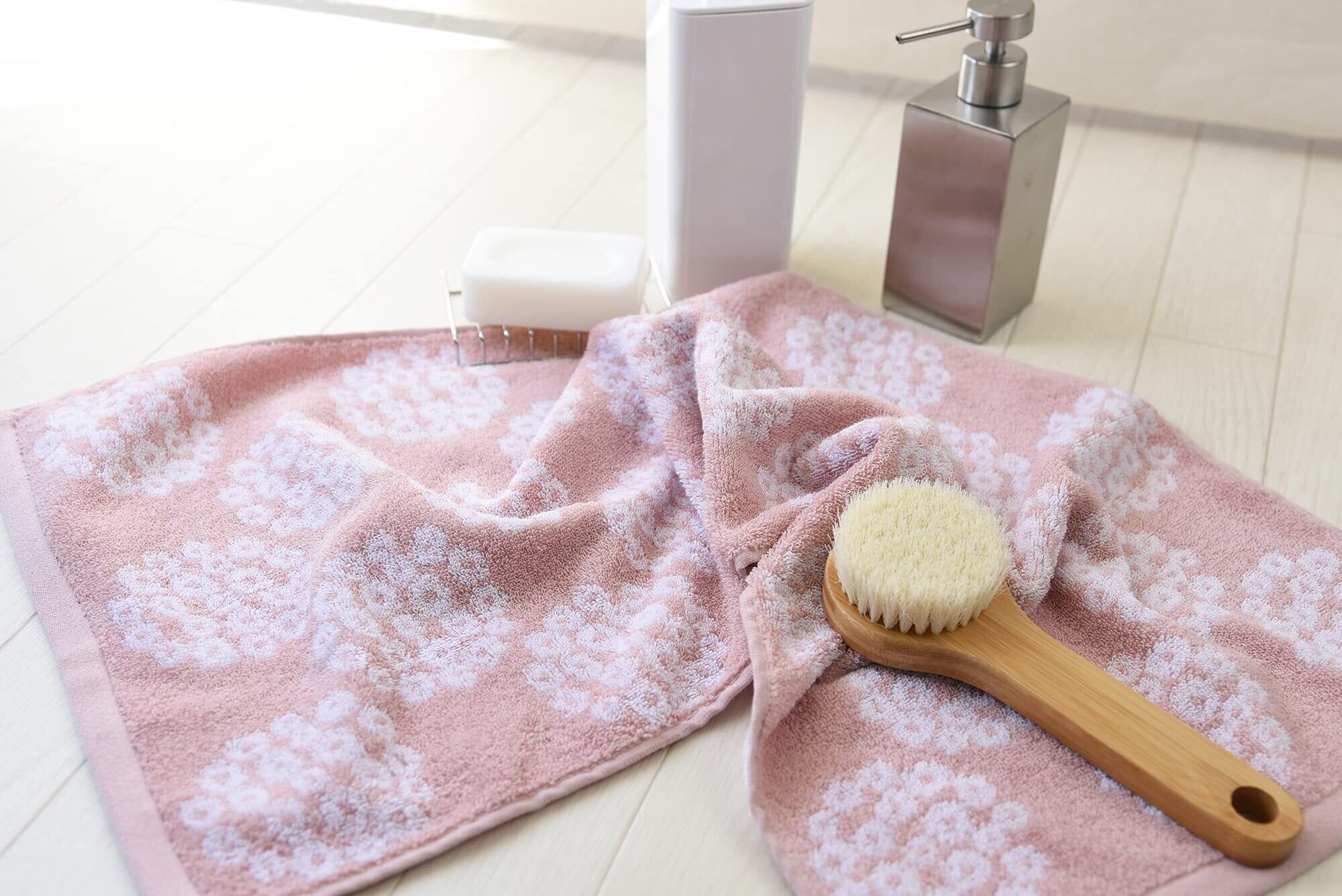 「花束」をモチーフにつくられたデザイン。少しくすんだ色合いが優しいイメージとぴったりです。普通の糸より、撚りが甘いあま撚り糸を使った、ふんわりと肌触りのやさしいタオルです。