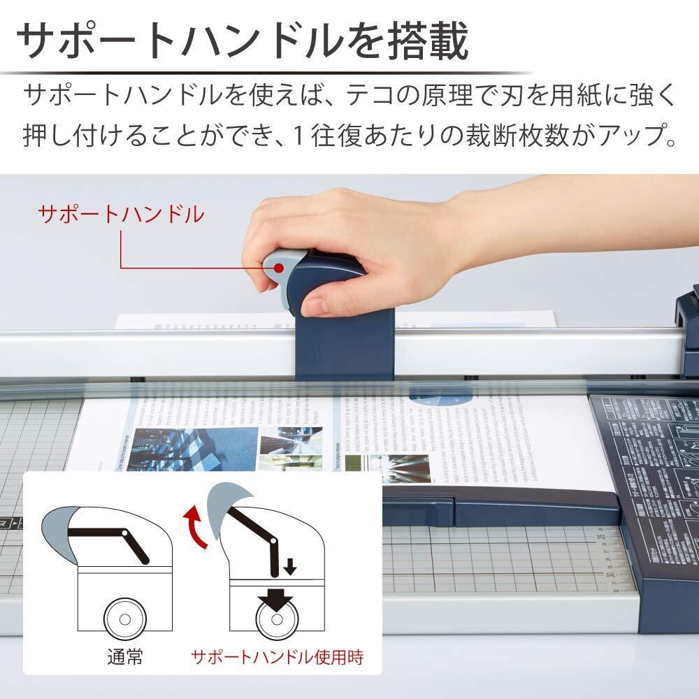 ・サポートハンドルを搭載:サポートハンドルを使えば、テコの原理で刃を用紙に強く押し付けることができ、1往復あたりの裁断枚数がアップ。