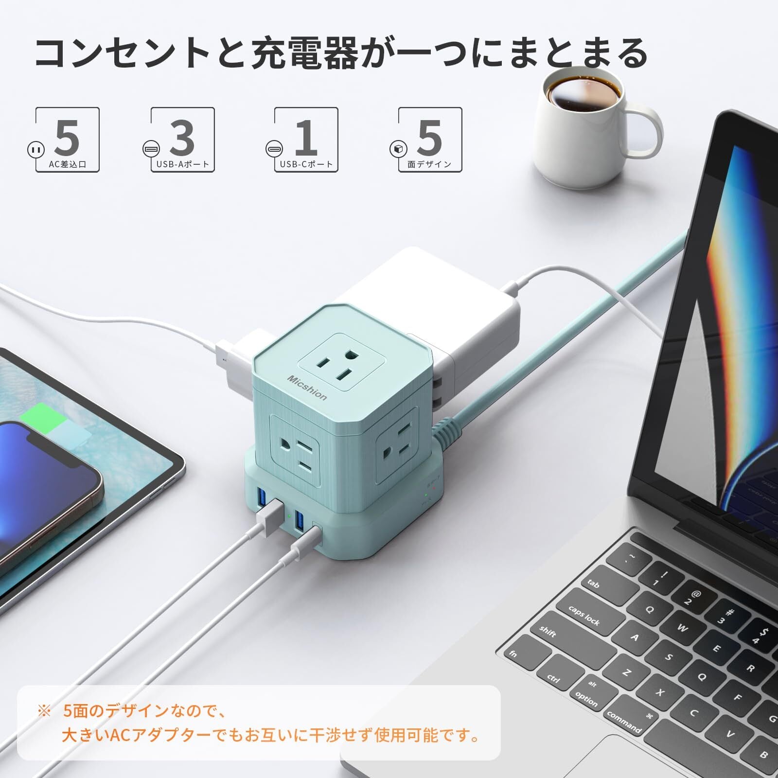Micshion キューブ型電源タップ(2400W) Type-C付 延長コード 2m コンセントusb付き 雷ガード 5個AC口 3個USBポート 1個Type-C 電源タップ usb付き タコ足配線 テーブルタップ マルチタップ 安全保護機能 自宅用 会社用 ブルー 青色 | BASE SHOP