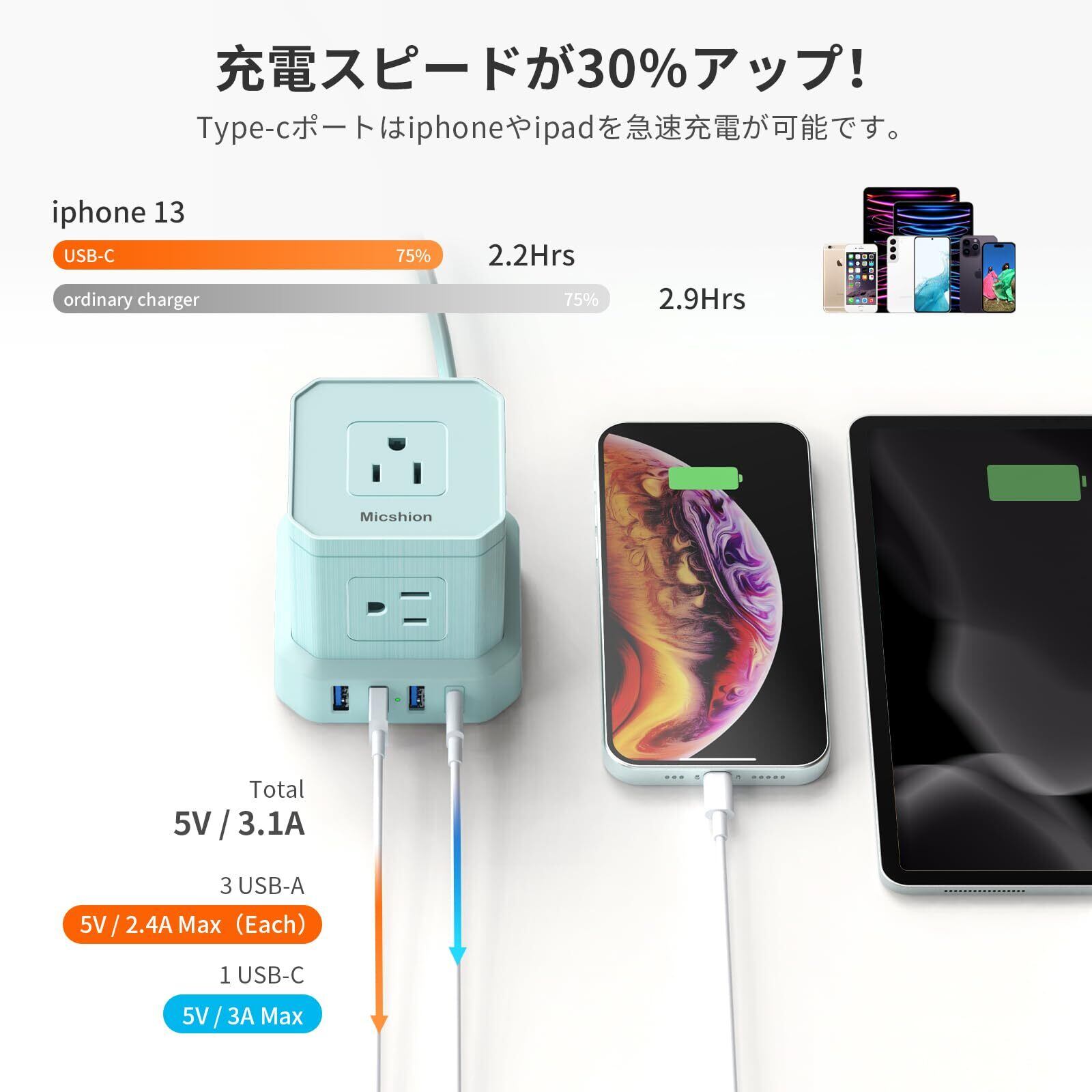 【5個ACポートと4個USBポート】5口のAC差込口と1つのUSB Type-Cポート、3つのUSB-Aポートを備えており、スマホやタブレットをコンセント タップ用プラグなしで接続できる手軽さも適当です。USB Type-Cポートは、iPhoneへ一般的な5W出力の充電器に比べ、充電スピードが30%アップします。複数機器を接続した場合、最大2400Wの消費電力に対応し、自動判別機能を通して、接続されたデバイスに最適な電流を出力します。パソコンやテレビ周りなど、コードが集中しがちな場所でもすっきりと使えます。