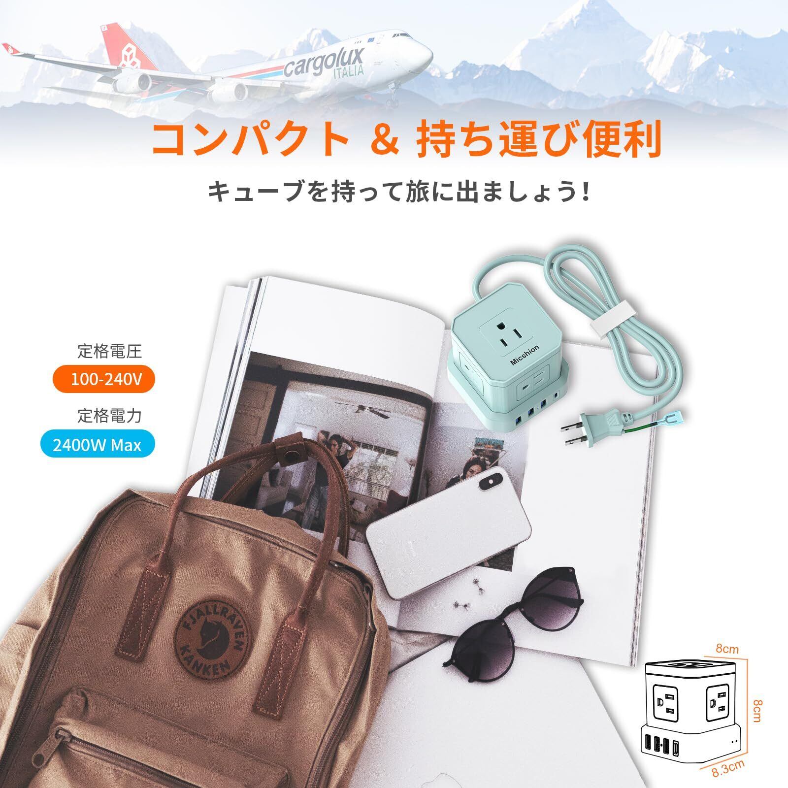 【広範囲電圧2400W&コンパクト】市販品の1500Wと比べて、このマルチタップは広範囲電圧技術を採用して、総電力は2400Wまで対応可能です。それに加えて、多数の差込口を備えながらも、幅8×奥行き8×高さ8.3cmとコンパクトで、省スペースで使えるので、デスクの上やテレビ周りなど、さまざまな場所で重宝します。重さは432gと軽量で、持ち運びもしやすいので、旅先や出張先でのコンセント不足を解消できます。海外でも使用可能です。