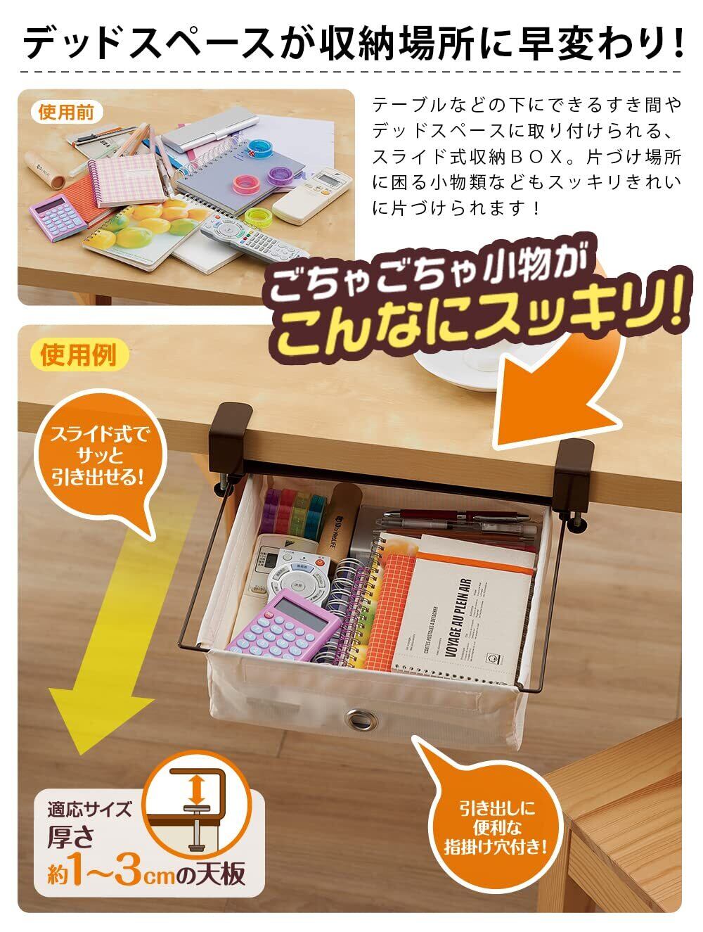 【スペース活用&大容量】テーブルや棚下の隙間やデッドスペースが活用できる取付式のスライド収納BOX。デスクや机下に隠せるタイプで、デスク収納空間を広げます。