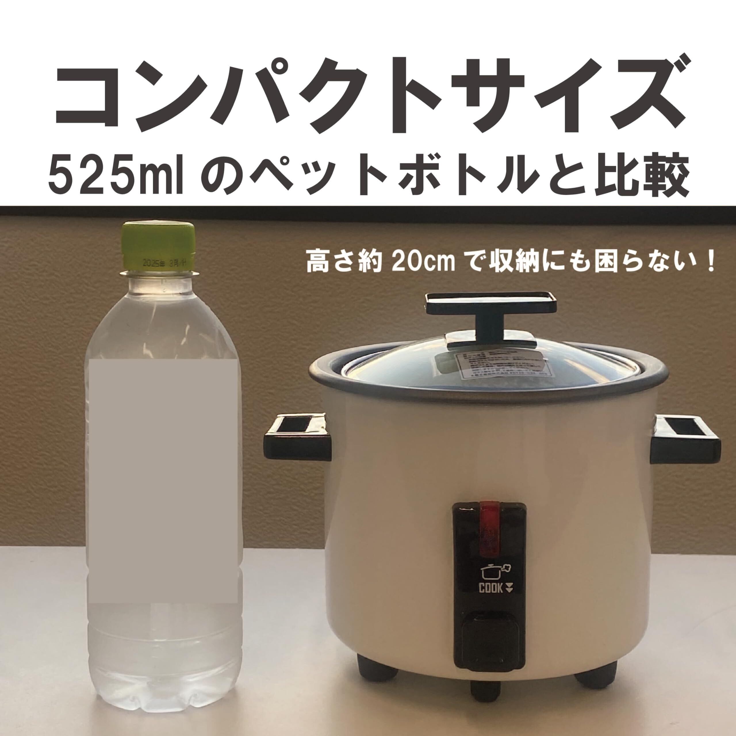 ・電源:AC100V 50/60Hz共用 ・消費電力:200W ・炊飯容量:0.5~1.5合 ・本体サイズ:約200(W)×168(D)×171(H)mm ・質量:約0.97kg ・付属品:計量カップ、しゃもじ