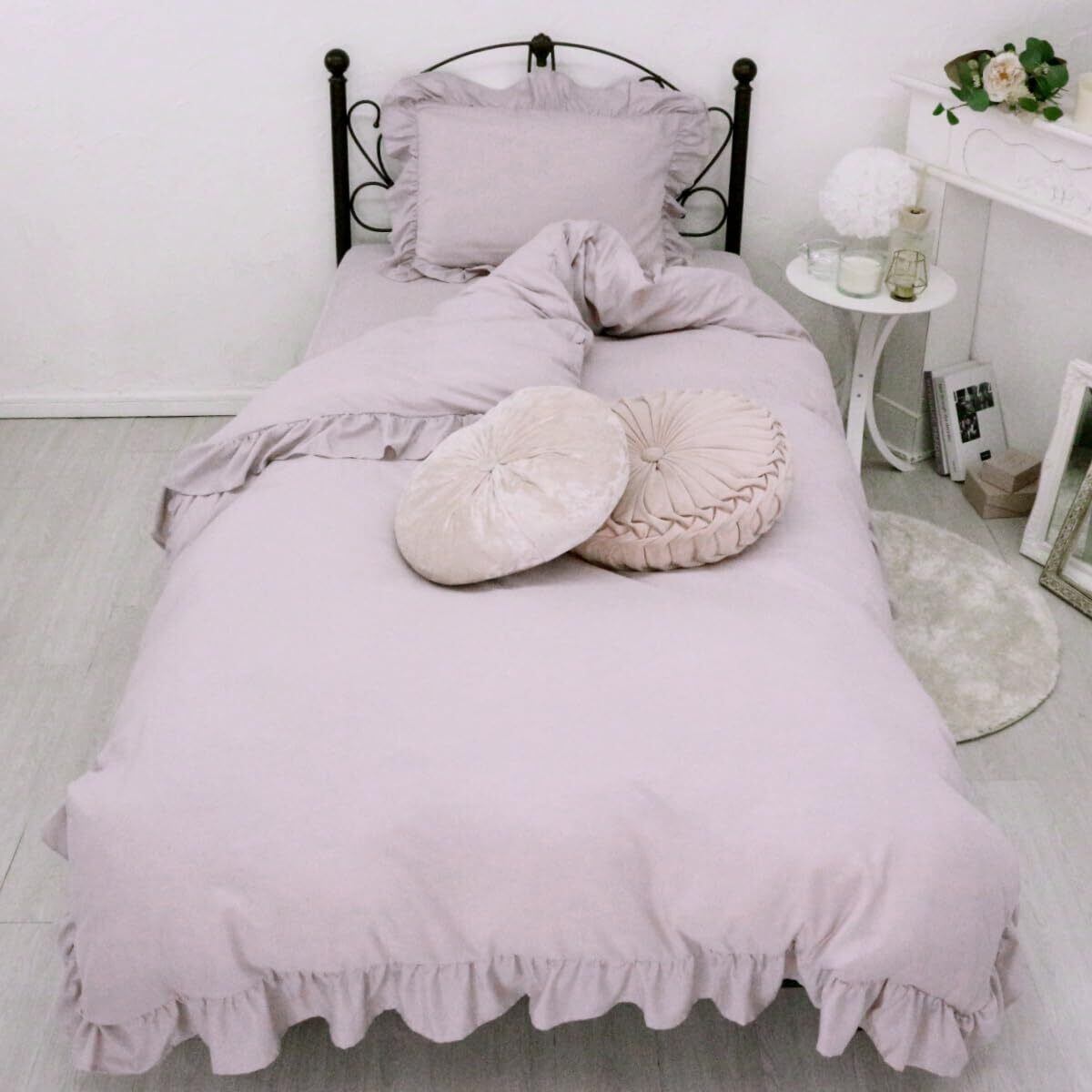 大人可愛いフリル布団カバー。オールシーズン使えて、どんなインテリアにも合わせやすいアイテム。フェミニンなフリルデザインですが、選べる6色のくすみカラーよりあなたのお部屋を、可愛いプリンセス系や、大人可愛い系などに演出。ベット周りから、お部屋の雰囲気を変えてみませんか。 枕カバー、掛布団カバー、ボックスシーツが、各1枚ずつの3点セットなので、統一感が生まれ、お気に入りのお部屋にコーディネート出来ます。 しっとりやわらかな肌触りのピーチスキン加工。洗濯機OKなので、じゃぶじゃぶ洗えて乾きやすい素材。シワになりにくい生地なので、お手入れも気軽で簡単!ご自宅用はもちろん、大切な方へのギフトとしても最適!