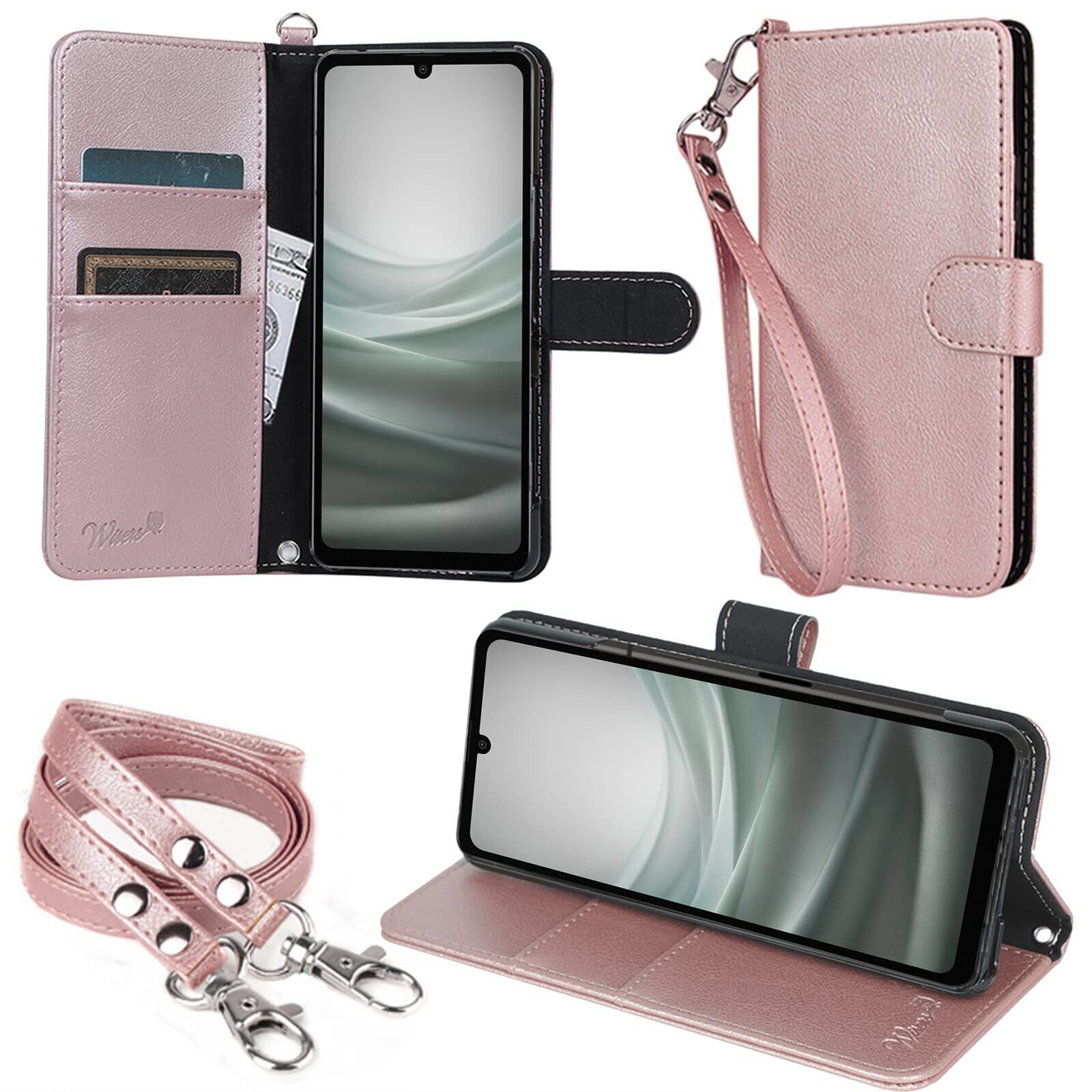 wisers AQUOS sense7 SH-53C / SHG10 対応 手帳型スマホケース (ローズゴールド) 牛革調PUレザー (カードホルダー/スタンド機能付き) ストラップ 2種付き (ハンドストラップ/ネックストラップ) | BASE SHOP