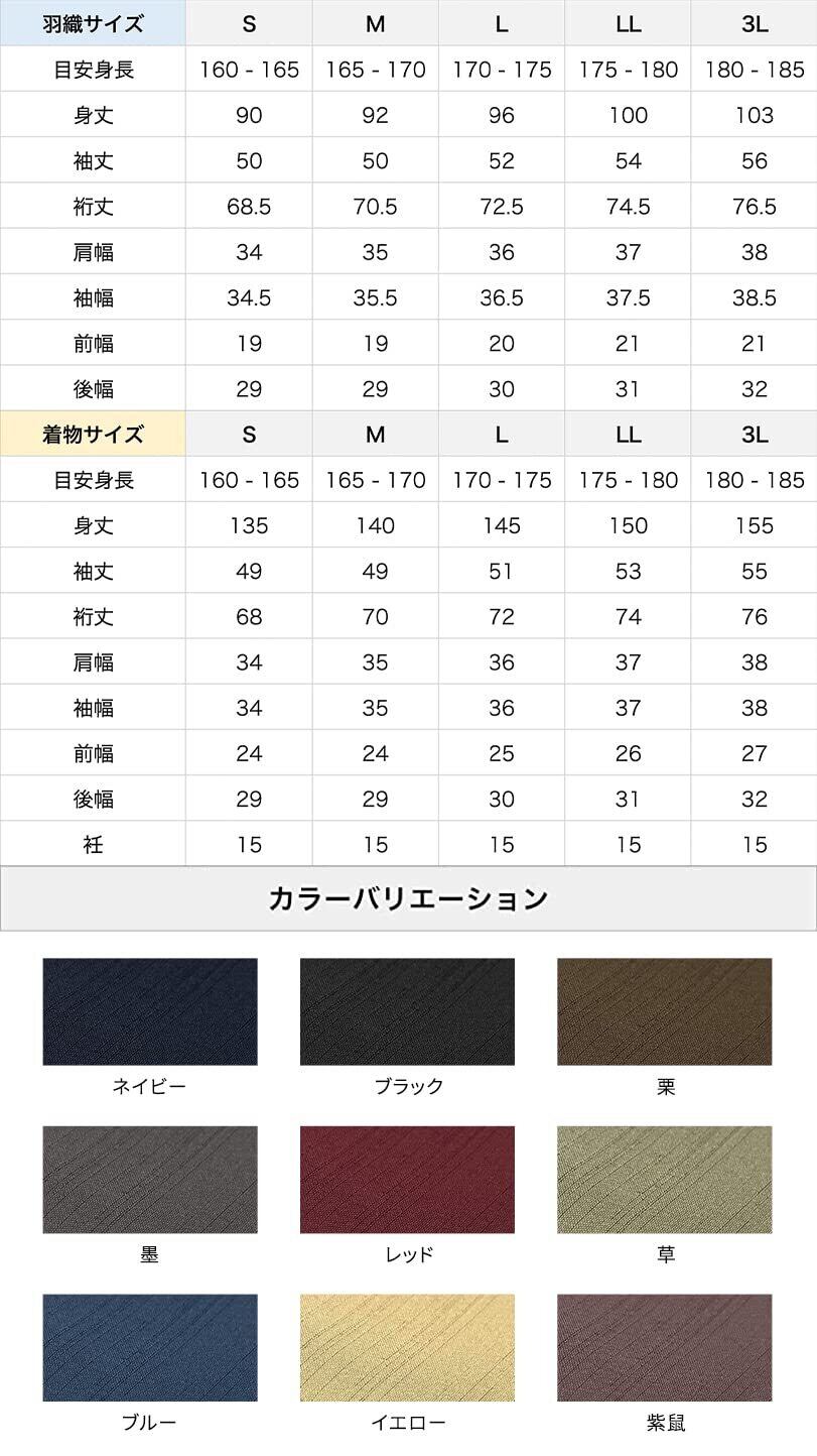 [サイズ]:目安身長、着物:身丈、袖丈、裄丈: S:160-165cm、135cm、49cm、68cm / M:165-170cm、140cm、49cm、70cm / L:170-175cm、145cm、51cm、72cm / LL:175-180cm、150cm、53cm、74cm / 3L:180-185cm、155cm、55cm、76cm