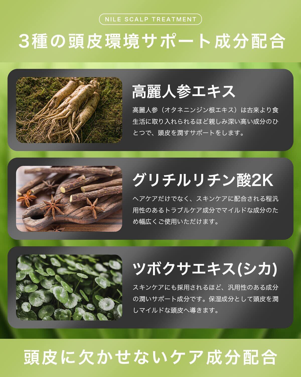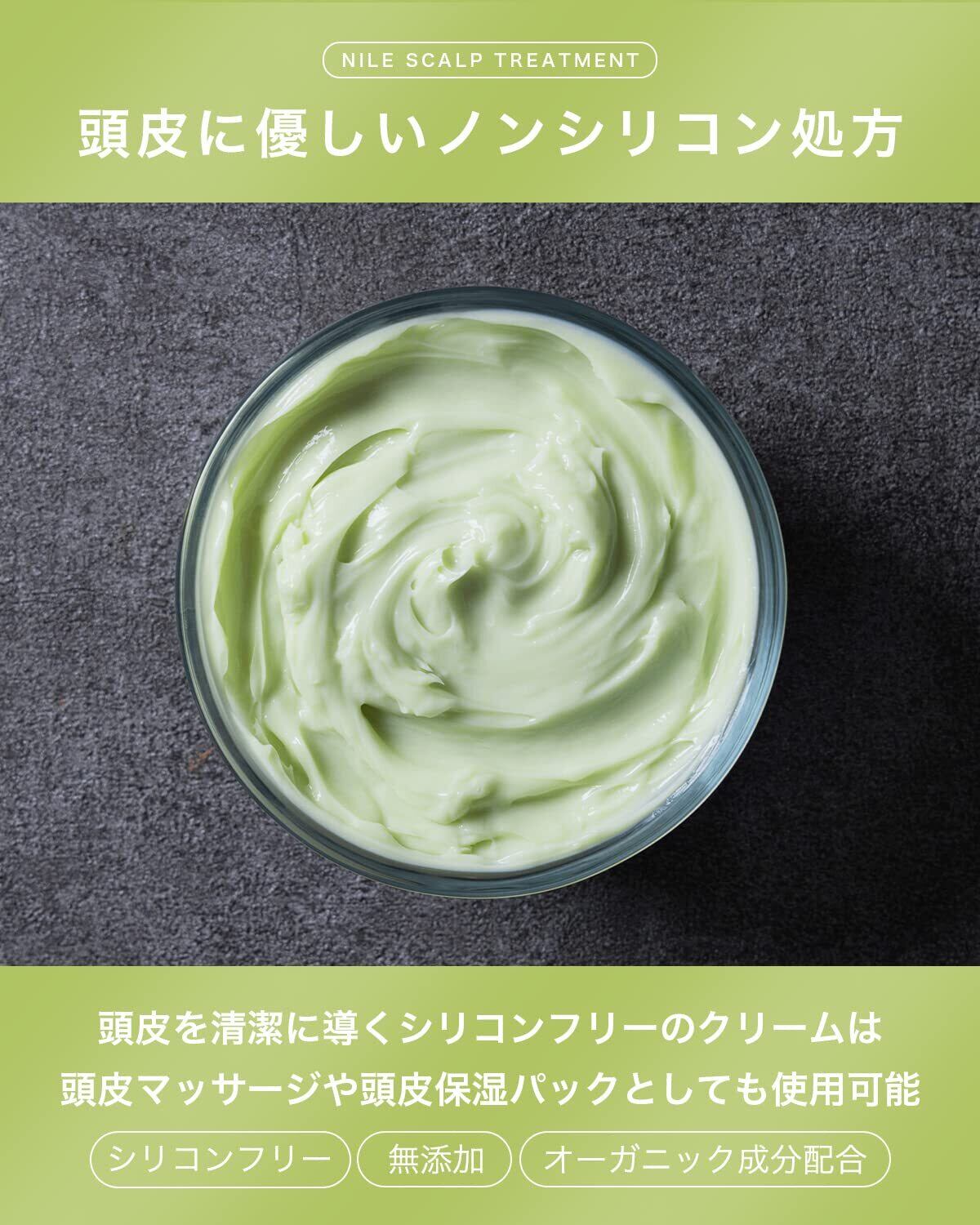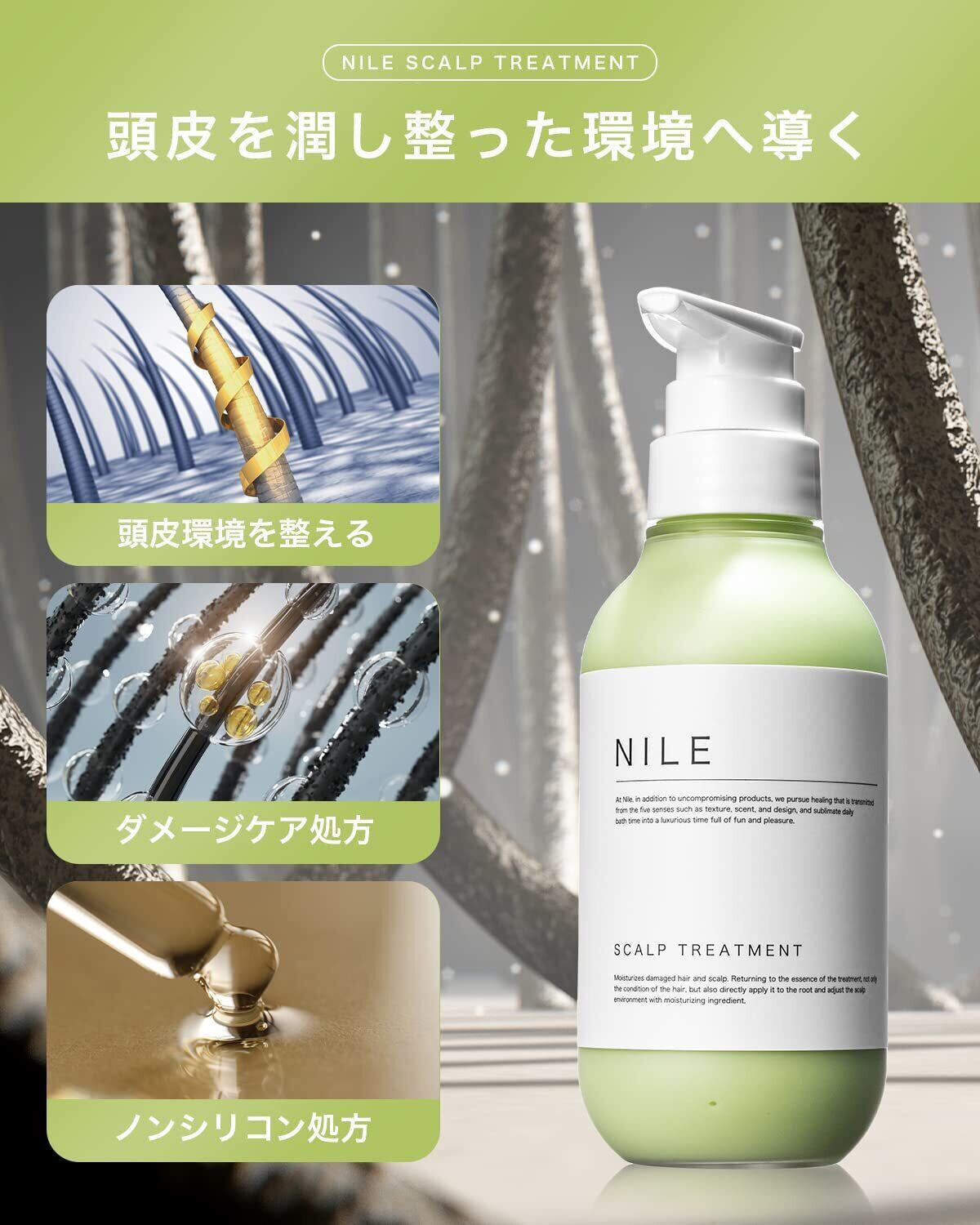 【頭皮へ直接塗りこみ活力頭皮へ導く】髪のダメージ補修を行うだけでなく、頭皮へ直接塗りこみ潤いを与えスカルプケアを行います。サラサラの髪へ仕上げるだけでなく、フワッと仕上がる髪へ導く頭皮用トリートメントです。 【頭皮に直接使用する頭皮用トリートメント】髪のダメージはもちろんのこと、頭皮に直接塗り込むことで頭皮を潤しスカルプケア成分を直接届けメンズの頭皮へアプローチします。 【頭皮に使用できるノンシリコン処方】ノンシリコン処方を採用しトリートメントを完成させることで、頭皮のことを考えたスカルプケア処方となっております。 【使用方法】NILEスカルフ゜シャンプーで頭皮を綺麗に洗浄した後、軽く水気をとり、2プッシュを目安に髪の長さ、毛量に合わせてトリートメントをご使用ください。髪に馴染ませるのはもちろん、頭皮にも使用していただけます。頭皮を動かしながら全体に馴染ませたら1分ほど放置し、ぬるま湯(36~38度)で洗い流してください。