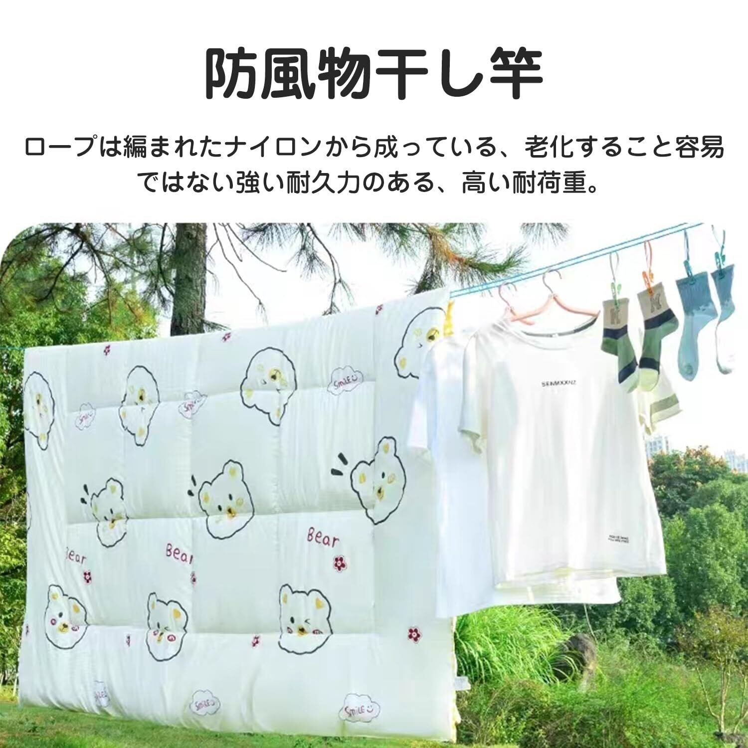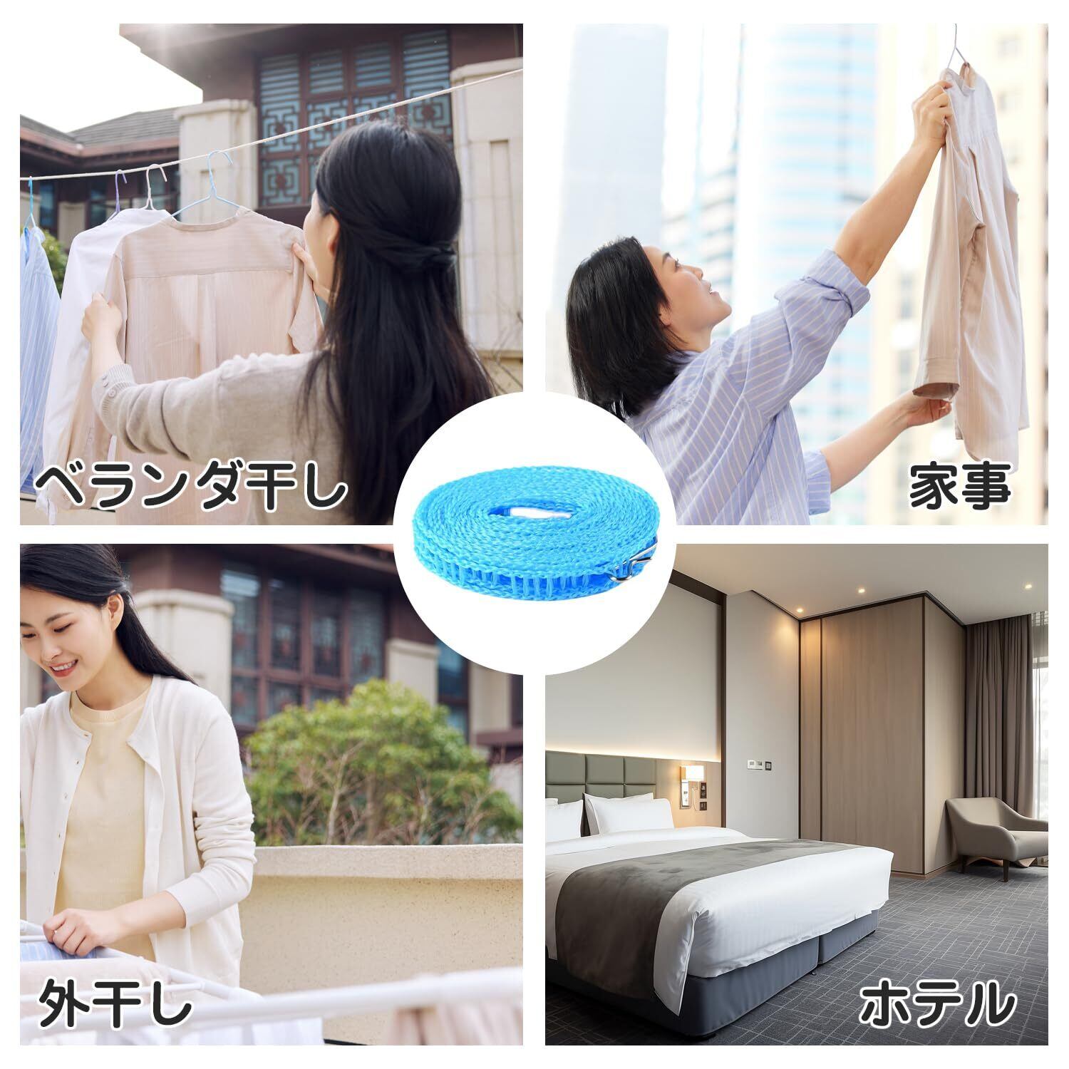 【簡単に固定】乾燥物の重量に耐えられる場所ならどこでもロープを巻き付け、両側のバックルで固定します。ロープをさらに数回巻き付けて、洗濯ロープを真っ直ぐにしっかりと固定してください。重い服を掛けても曲がりにくくなります。