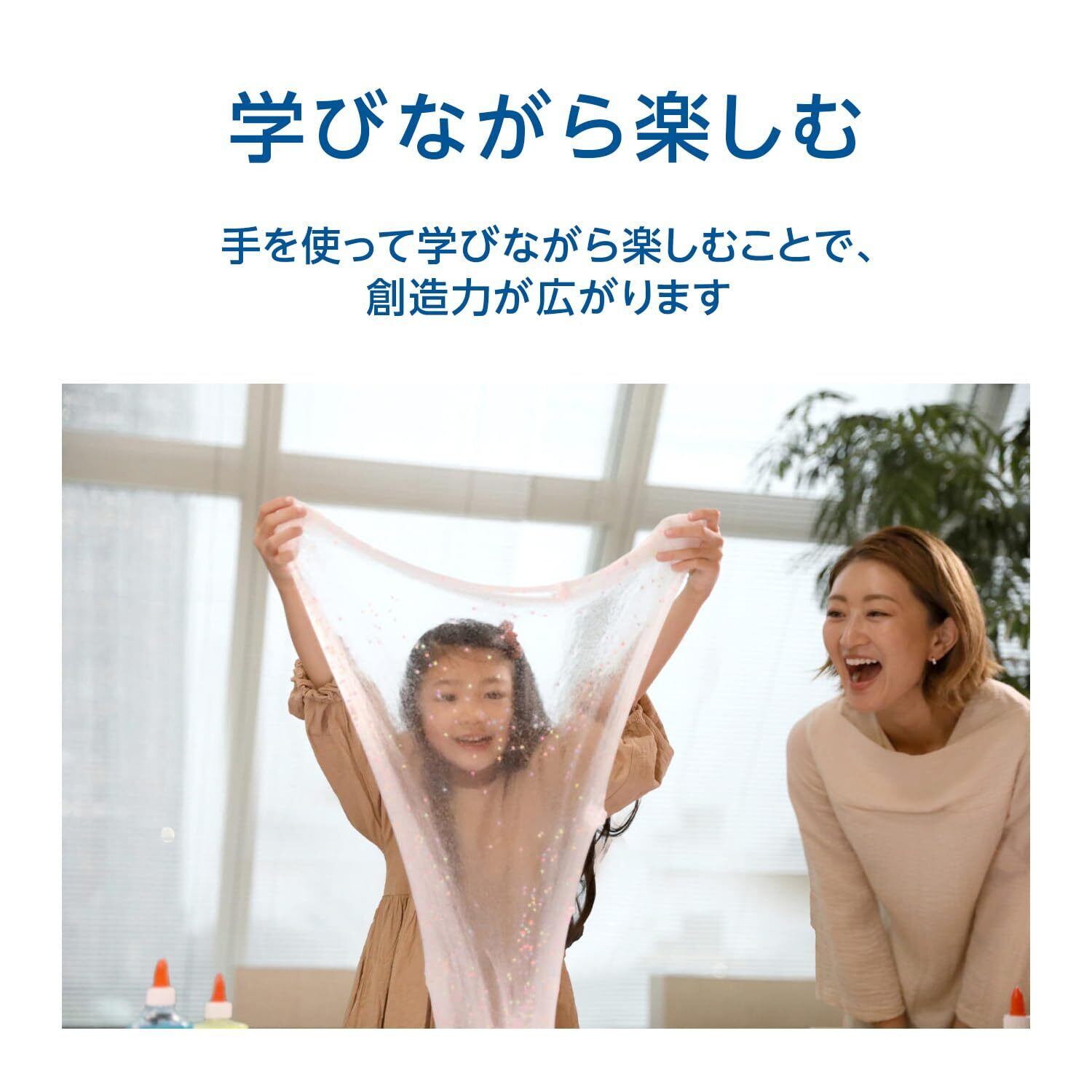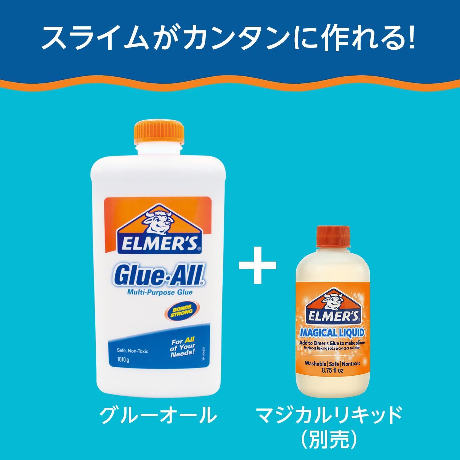 【大容量のエルマーズの液体のり】紙はもちろん、様々な事務作業、封筒、ペーパークラフト、布製品、木材、ダンボールなどの接着に便利な液体のりELMER'S マジカルリキッド(別売)を使うと、お子様でも簡単にオリジナルのスライムが作れます。