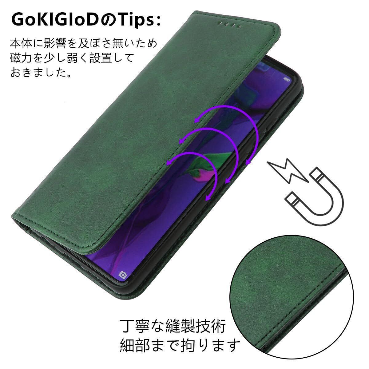 らくらくスマートフォン F-53E ケース 手帳型 ストラップ 同梱 適用 F53E スマホケース 手帳 F53Eカバー ドコモ F-53Eケース 携帯ケース 【GoKIGIoD】 財布型 内蔵マグネット 弱磁 カード収納 ストラップホール スタンド機能 耐衝撃 レトロ グリーン