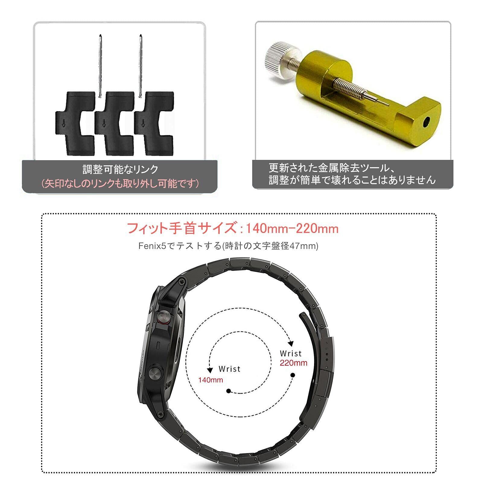 【手首サイズに適合】 テストにはFenix 5(直径47mm)を使用しています。リストバンドは、155mmから220mmの手首サイズに適しています。付属の調整工具で、留め金を加えたり外したりすることができで、自分の手首周り寸法によってバンドの長さを調整することが可能です.
