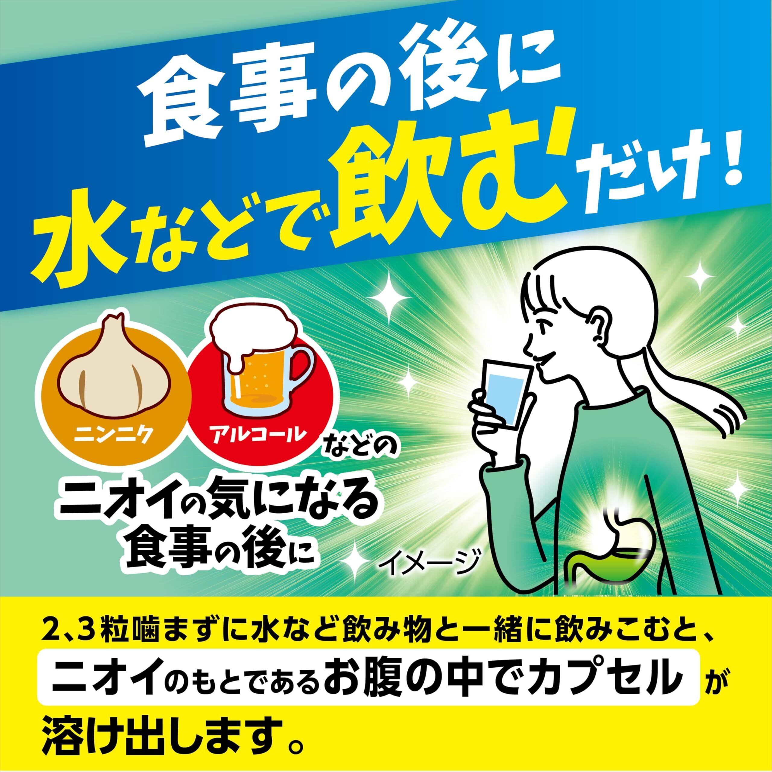 ●おなかの中から息をリフレッシュする口臭予防カプセル●にんにく料理、アルコ-ルなどの飲食後に最適●エコ包装になってゴミが少なくなりました