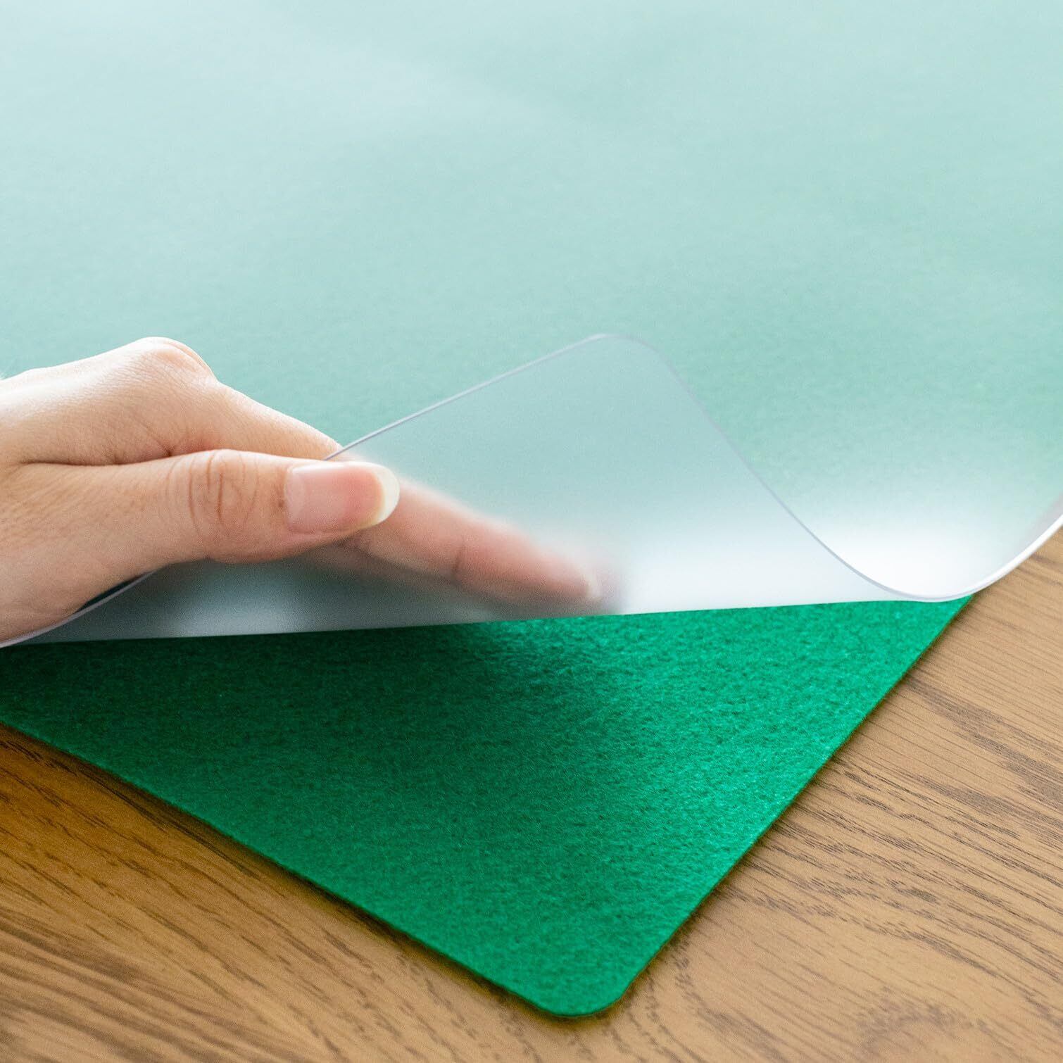 シボ入り「ノングレア」(反射抑制) / 材質:マット=40%再生樹脂、軟質ポリ塩化ビニル(PVC)1.2mm厚、下敷=70%再生不織布(PET)0.7mm厚