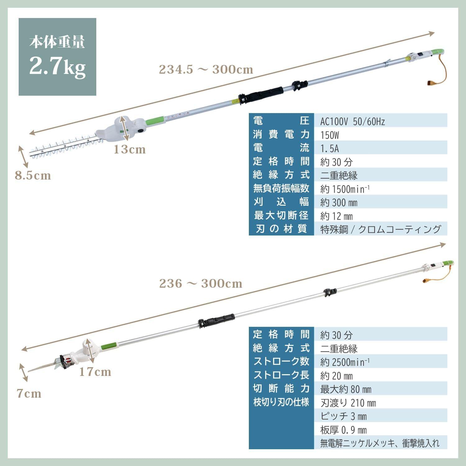 【仕様】サイズ:幅234.5~300×奥行8.5×高さ13cm(ガーデントリマー)、幅236~300×奥行7×高さ17cm(ガーデンソー)/重量:約2.7kg (最長時)/電圧:AC100V 50/60Hz /消費電力:150W/電流:1.5A/定格時間:30分/絶縁方式:二重絶縁