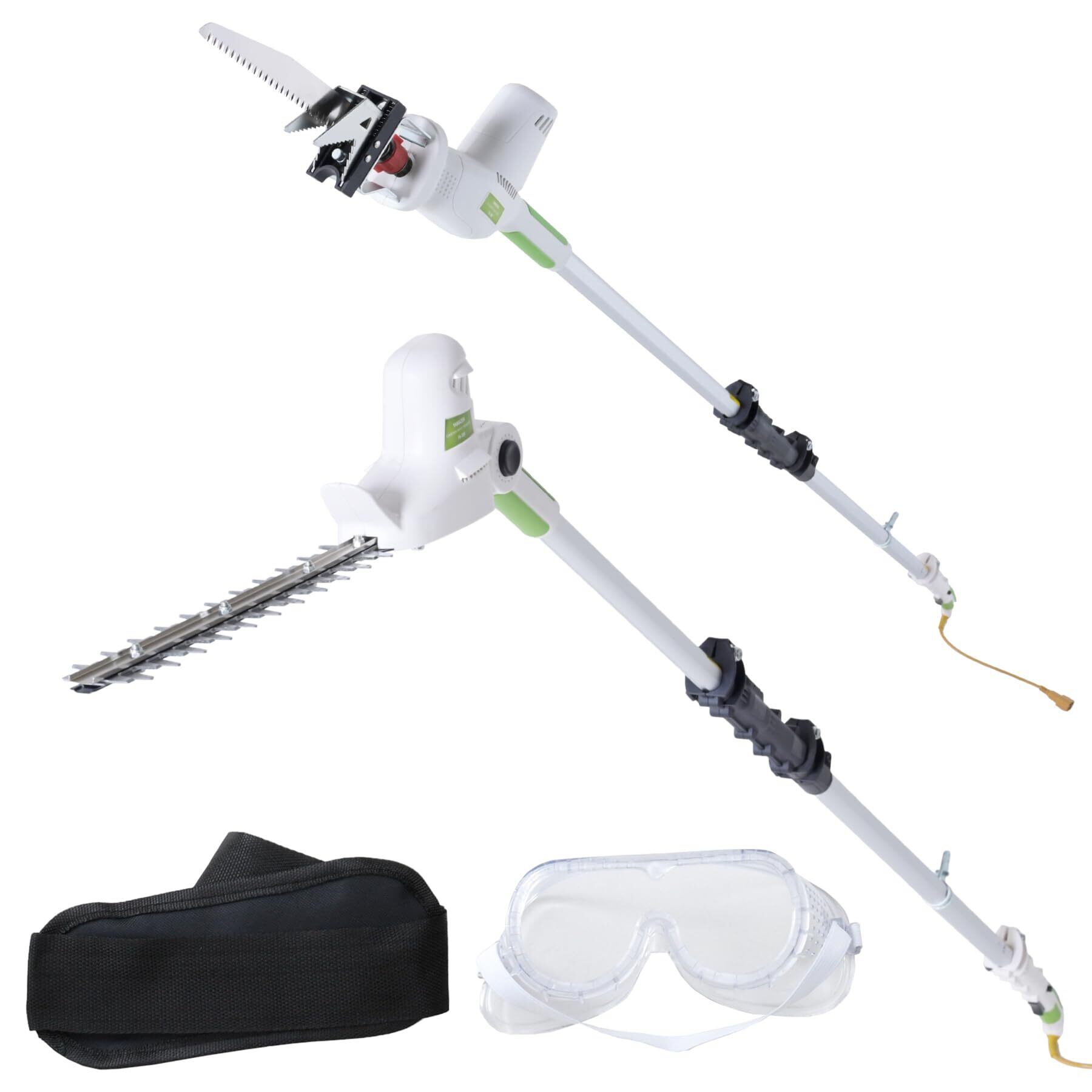 【特徴】ガーデントリマー&ガーデンソー の4WAYセットです。これ1台あればお庭のすべての剪定作業が快適に!ヘッドやポールを取り換えるだけで4つの剪定作業ができます。<ガーデンポールトリマー>刈り込み幅約300㎜の両刃駆動で切れ味抜群です。スムーズな刈り込みを実現しました。伸びきった生垣の剪定に最適です。作業する場所に合わせて、144度(9段階)でヘッジの角度を調節することができます。また着脱式伸縮延長ポールの着脱伸縮によって短縮時約130cmから最長約300cmの高さに合わせることができます。下草も立ったまま刈れるので作業がとても楽ちんです。簡単に着脱できる伸縮ポールだから収納もコンパクトにできます。またお家以外の場所で使う時も持ち運びやすく、ブレードカバーも付いているので安全で便利です。充電切れの心配なしAC電源タイプでパワフルにお使いいただけます。