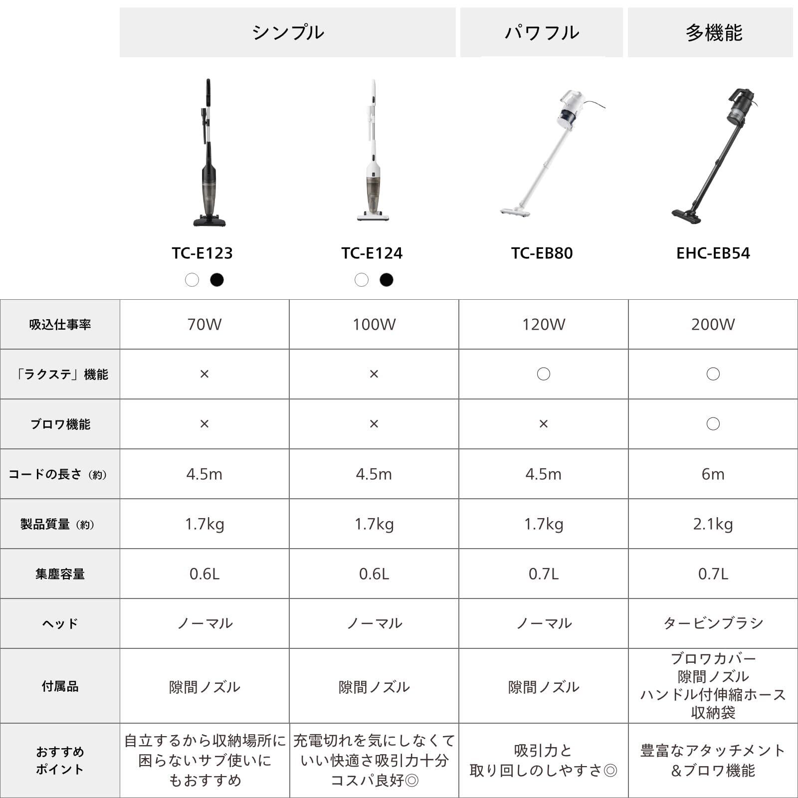 TC-E123は、軽量1.7kg、吸込仕事率70Wの軽さとパワーを兼ね備えた、シンプルなスティッククリーナーです。ハンドルを外せば、ハンディクリーナーとしても使える2WAY仕様。スティックの時もハンディの時も手元にスイッチが来るよう、配置を工夫しました。シンプルな使いやすさを追求した、一人暮らしにおすすめの掃除機です。