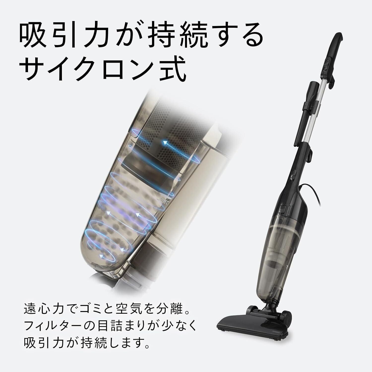 【サイクロン式だから吸引力が持続】遠心力でゴミと空気を分離。フィルターの目詰まりが少なく吸引力が持続します。アウターフィルターと布フィルターの2層構造で微細なゴミやほこりをしっかり取り除きます。