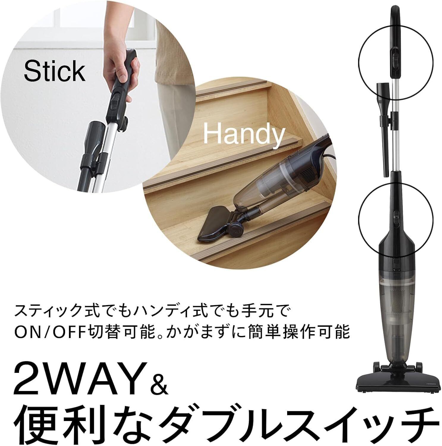 【便利なダブルスイッチ】スティック式でもハンディ式でも手元でON/OFF切替可能。かがまずに、簡単操作が可能です。