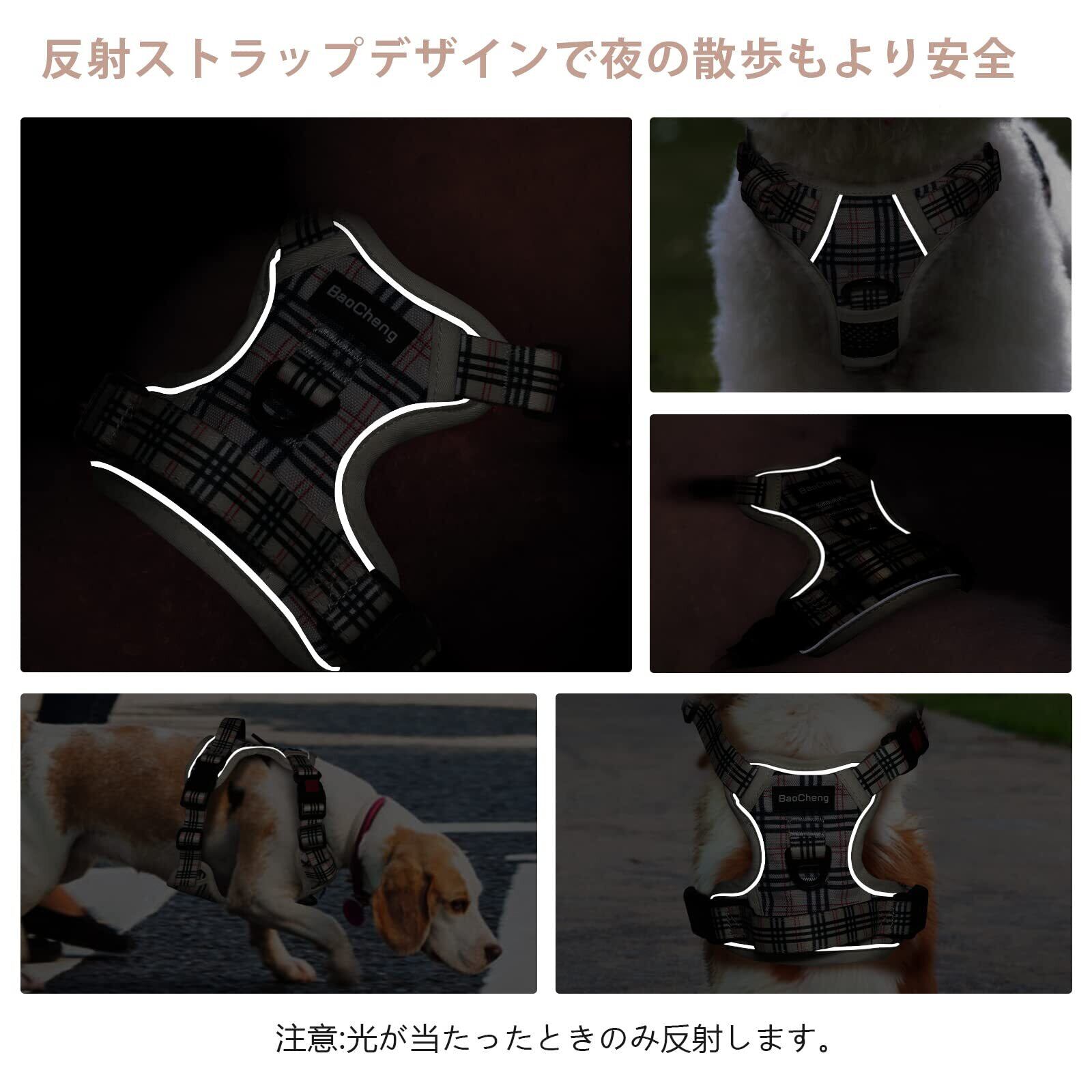[2025最新型犬ハーネス]BaoCheng 犬用胴輪 小型犬/中型犬/大型犬ハーネス 犬用胴輪 引っ張り防止 アタマを通さず 咳き込み軽減 サイズ調整可能 夜間反射材 抜けない 通気性 簡単着脱 おしゃれ 安全 しつけ用 訓練 歩行補助 散歩 可愛い(ベージュチェック柄,S)