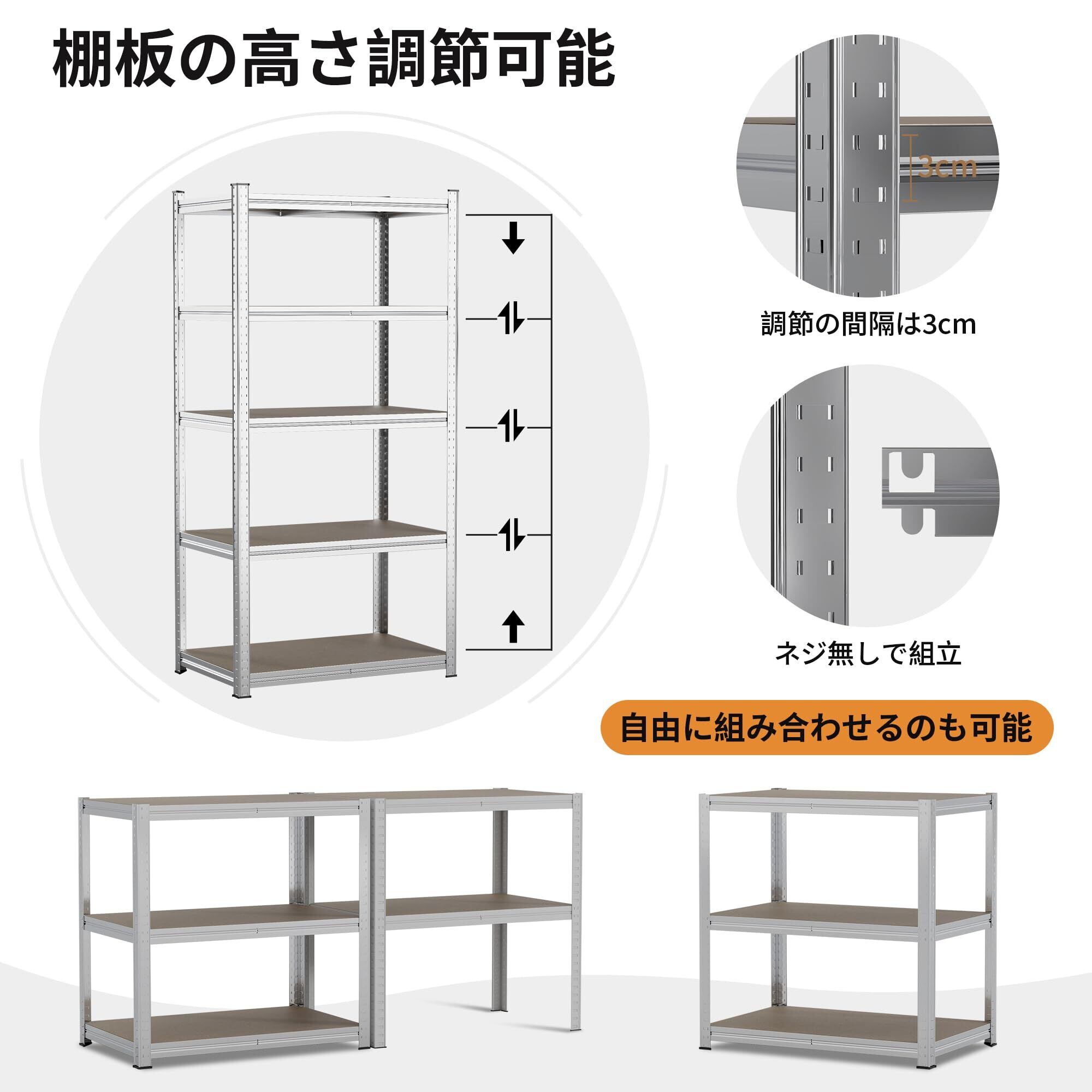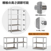 【棚板が高さ調整可能】棚板は全部で5段あり、各段階の高さはお客様のニーズに応じて選択・調整が可能です。小物が置けるぐらいの高さにも調節できますし、棚板を外して、背の高いものも収納できます。棚板の高さも棚板の上下の向きを変えるので、ガレージ、シューズラック、倉庫収納など、自由自在に使えます。
