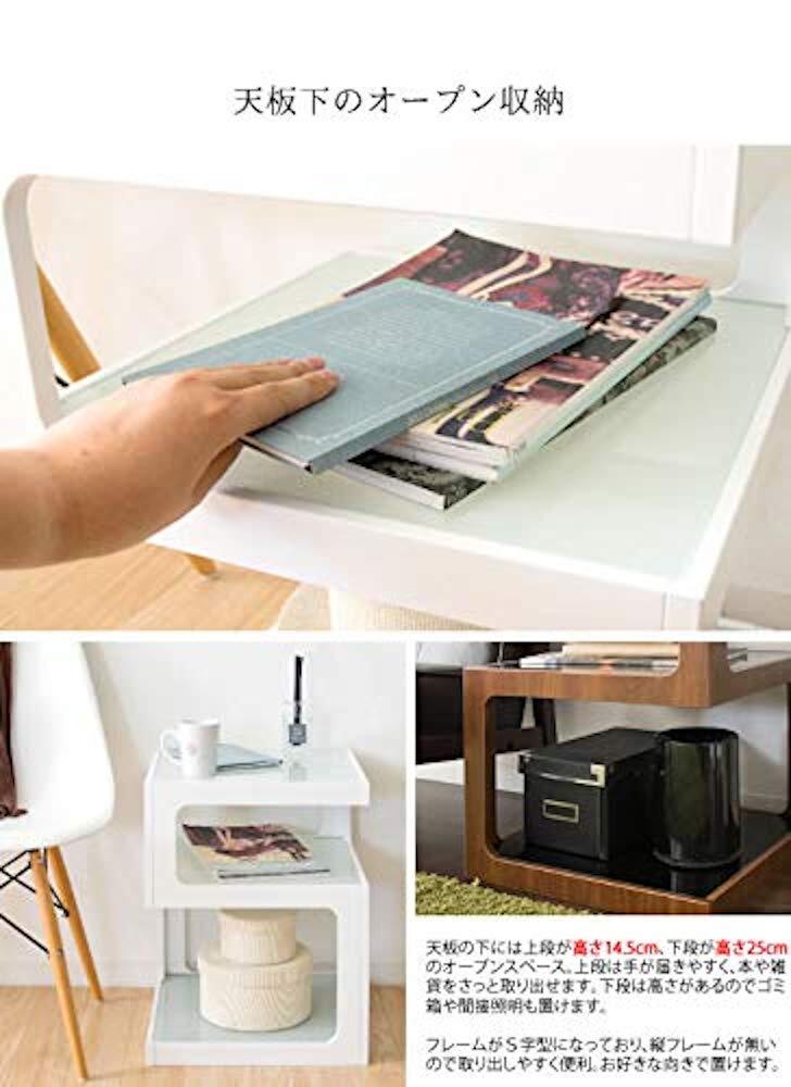 天板の下はガラス板のおしゃれなオープンスペースが2段あり、雑誌や新聞、高さのあるものも分けて収納できる