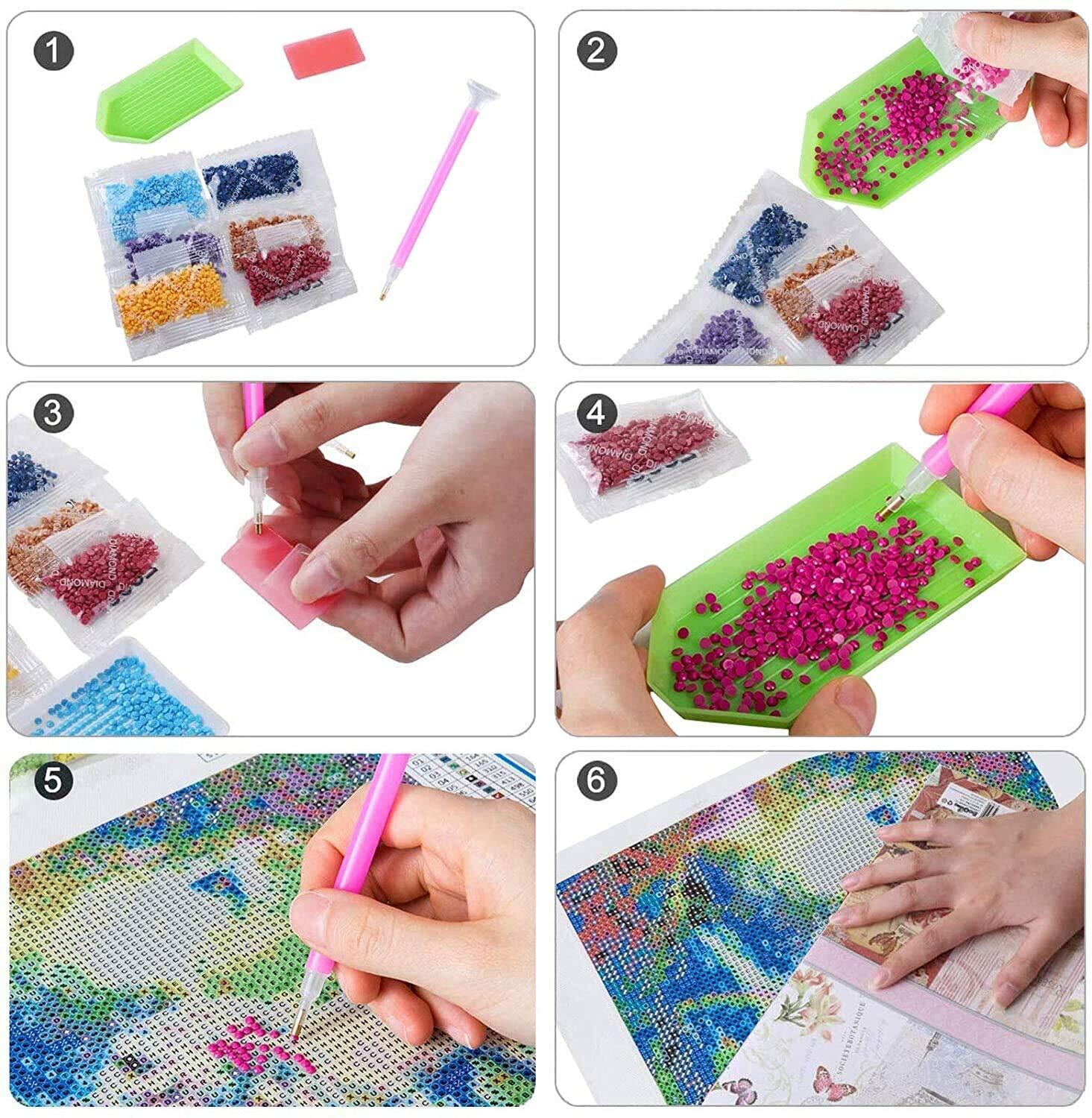 作り方は簡単:ペン先をピンクのグルーを付けて台紙にビーズと同じ記号または英数字を貼り付けるだけでキラキラなダイヤモンドアートが仕上がります。クロスステッチ刺しゅうより気軽になり、集中力がUP、達成感もじゅうぶん味わっていただけます