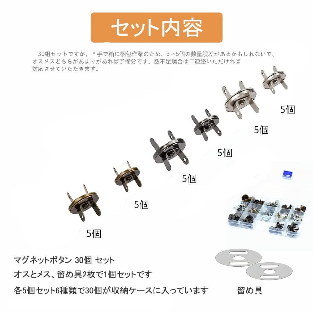 【セット内容】マグネットボタン 30個 セット、5個× 14mm&18mmシルバー、5 個× 14mm&18mmガンメタル、5 個×14mm&18mm古銅色(オスとメス、留め具2枚で1個セットです)各5個セット6種類で30個が収納ケースに入っています。
