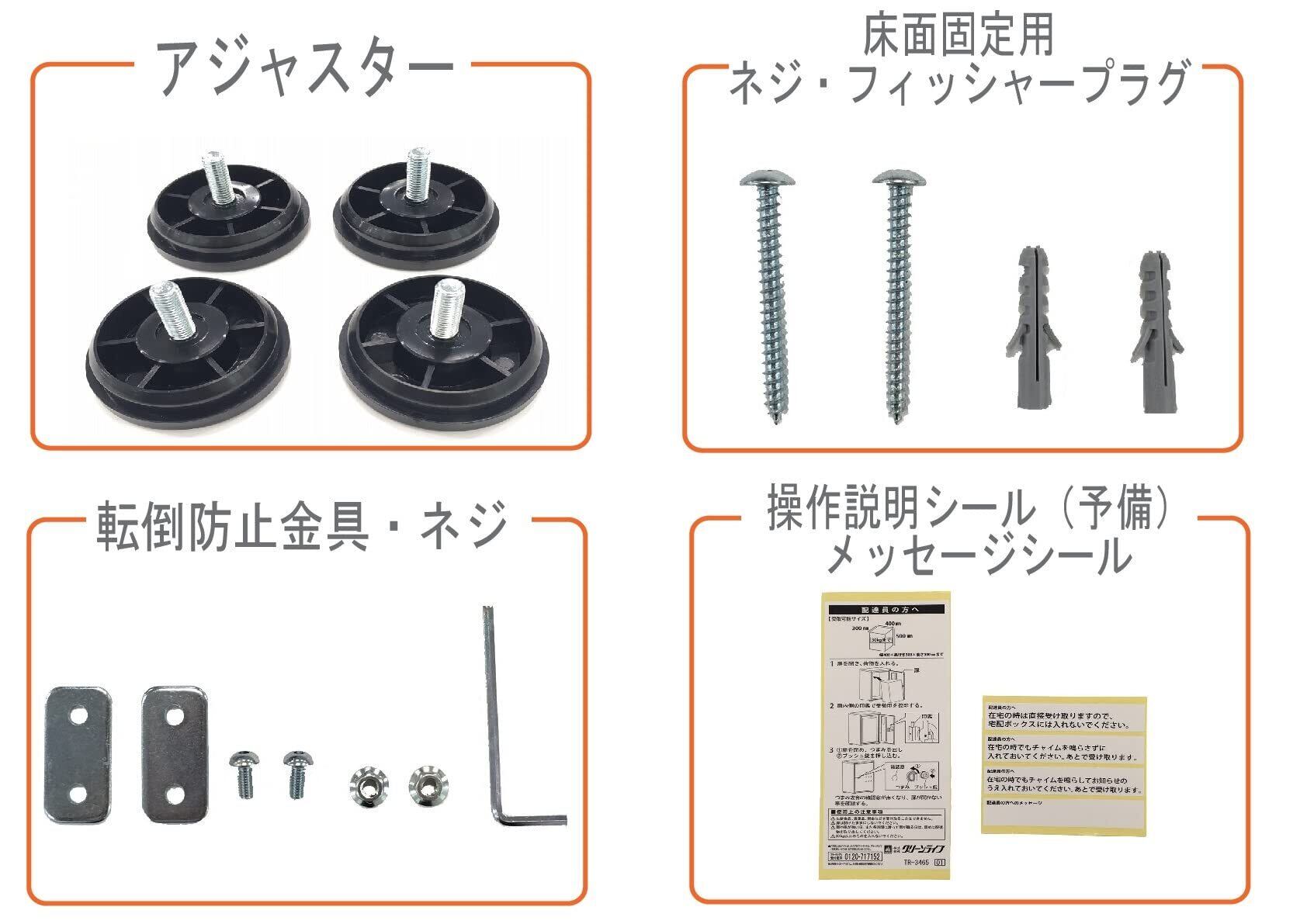 属品:床面固定用のネジ・フィッシャープラグ各2本、転倒防止金具2個、解錠用カギ2本、操作説明シール(予備)・メッセージシール各1枚付